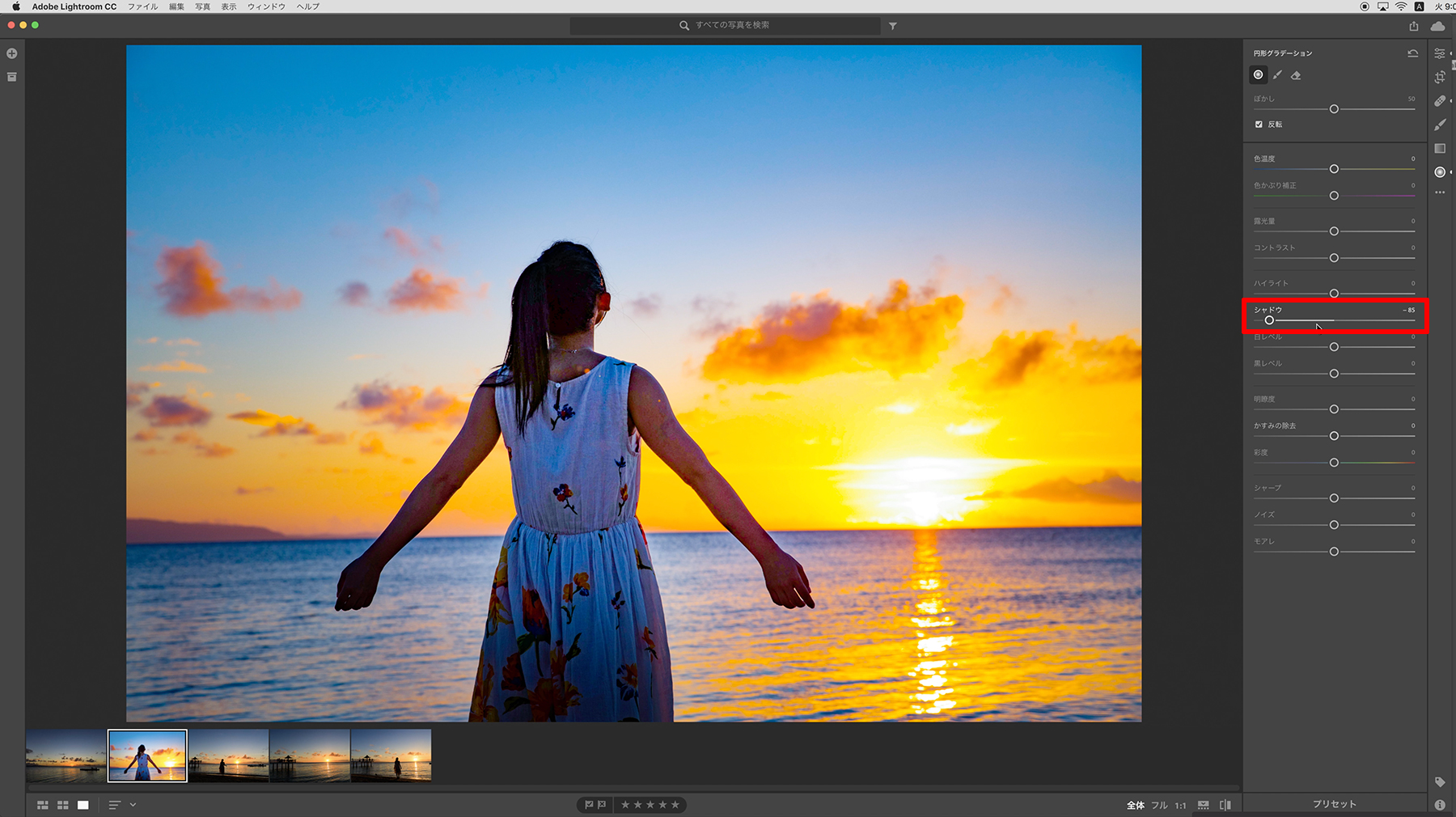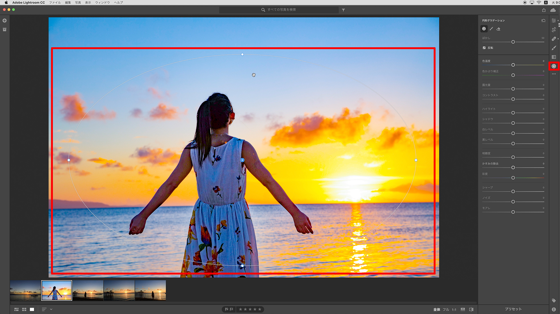 効果を適用する範囲を決めるために、右パネルの[円形グラデーション]をクリックし、写真の上でドラッグします。