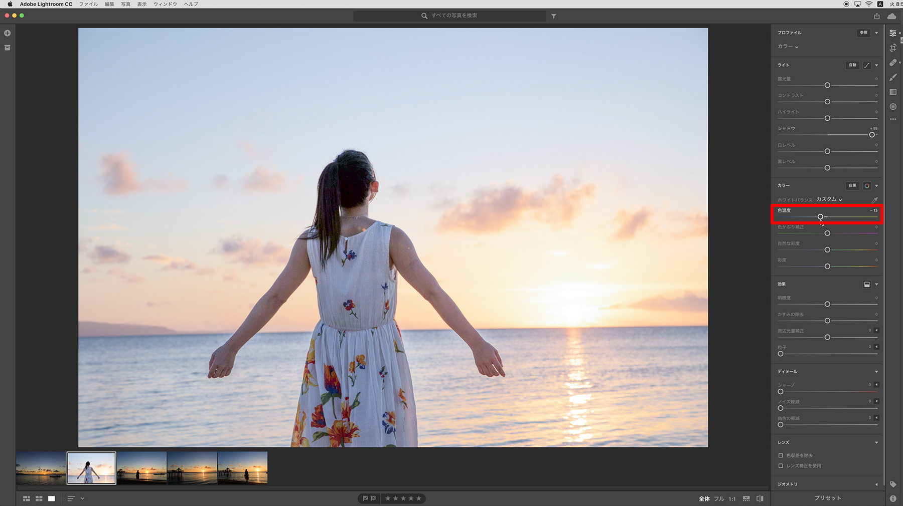 色味を調整するために、右パネルの[編集]→[カラー]→[色温度]のスライダーを左にドラッグします。