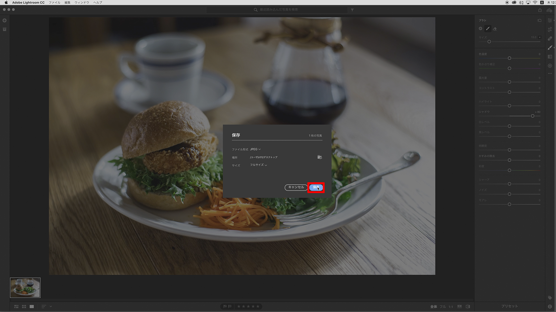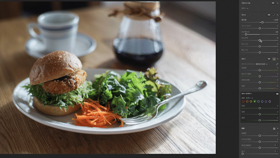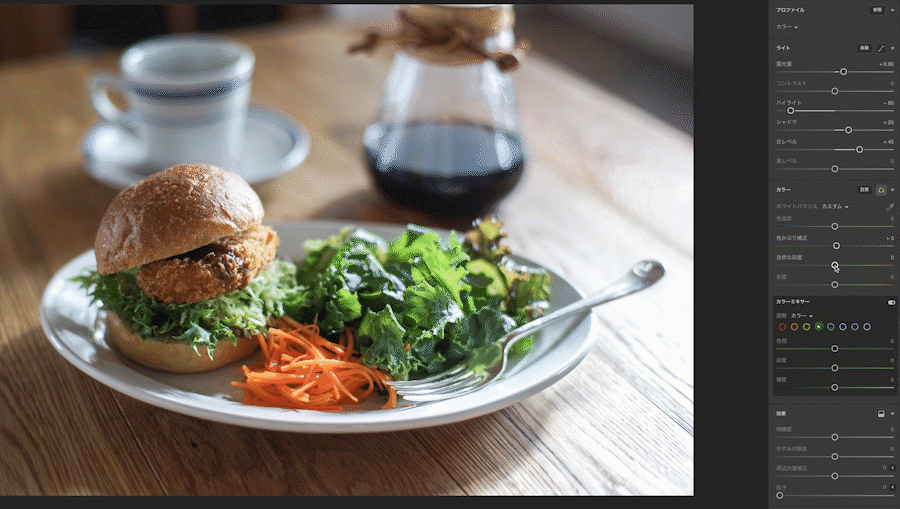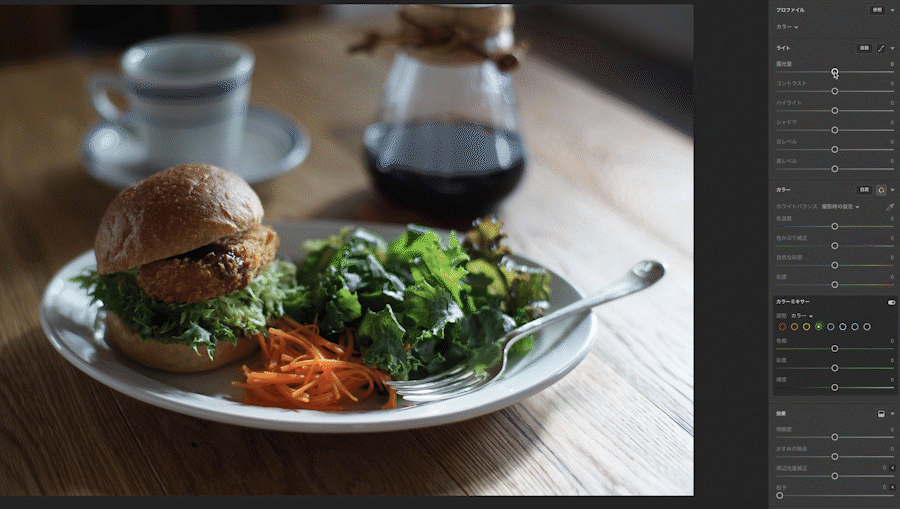写真の雰囲気が暗いので、右パネルの[編集]→[ライト]→[露光量]のスライダーを右にドラッグして調整します。