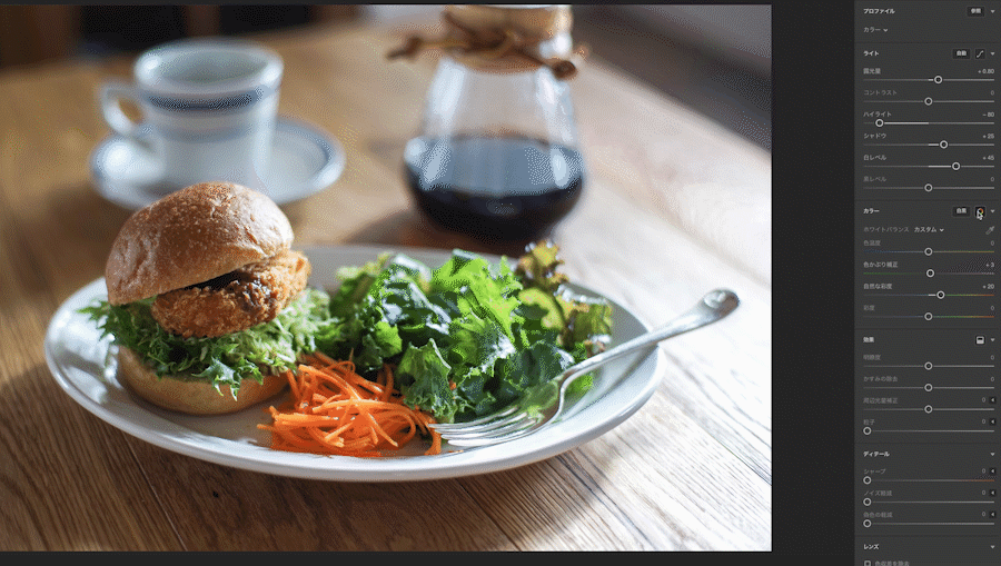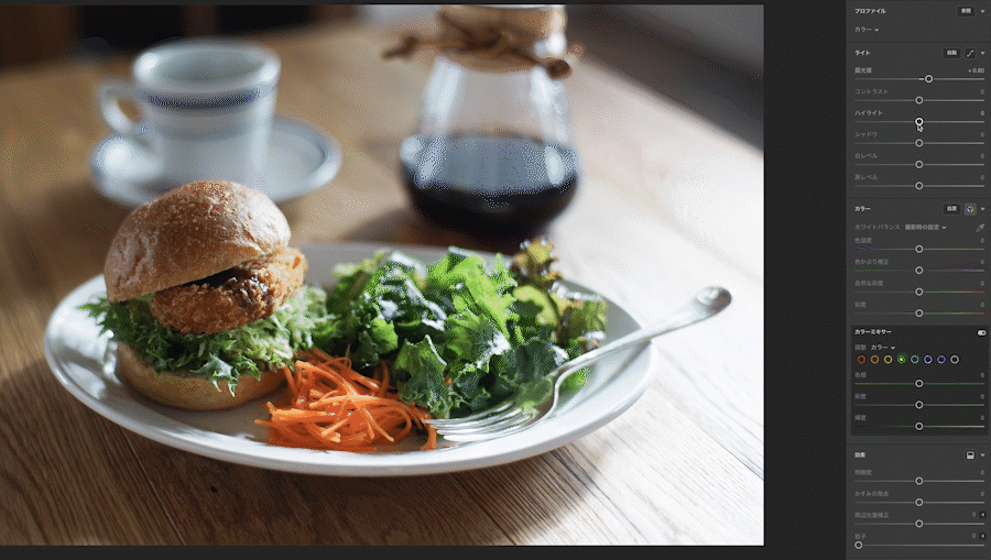 右パネルの[編集]→[ライト]→[ハイライト]のスライダーを左にドラッグ(マイナス)し、明るくなりすぎてしまった部分を調整します。