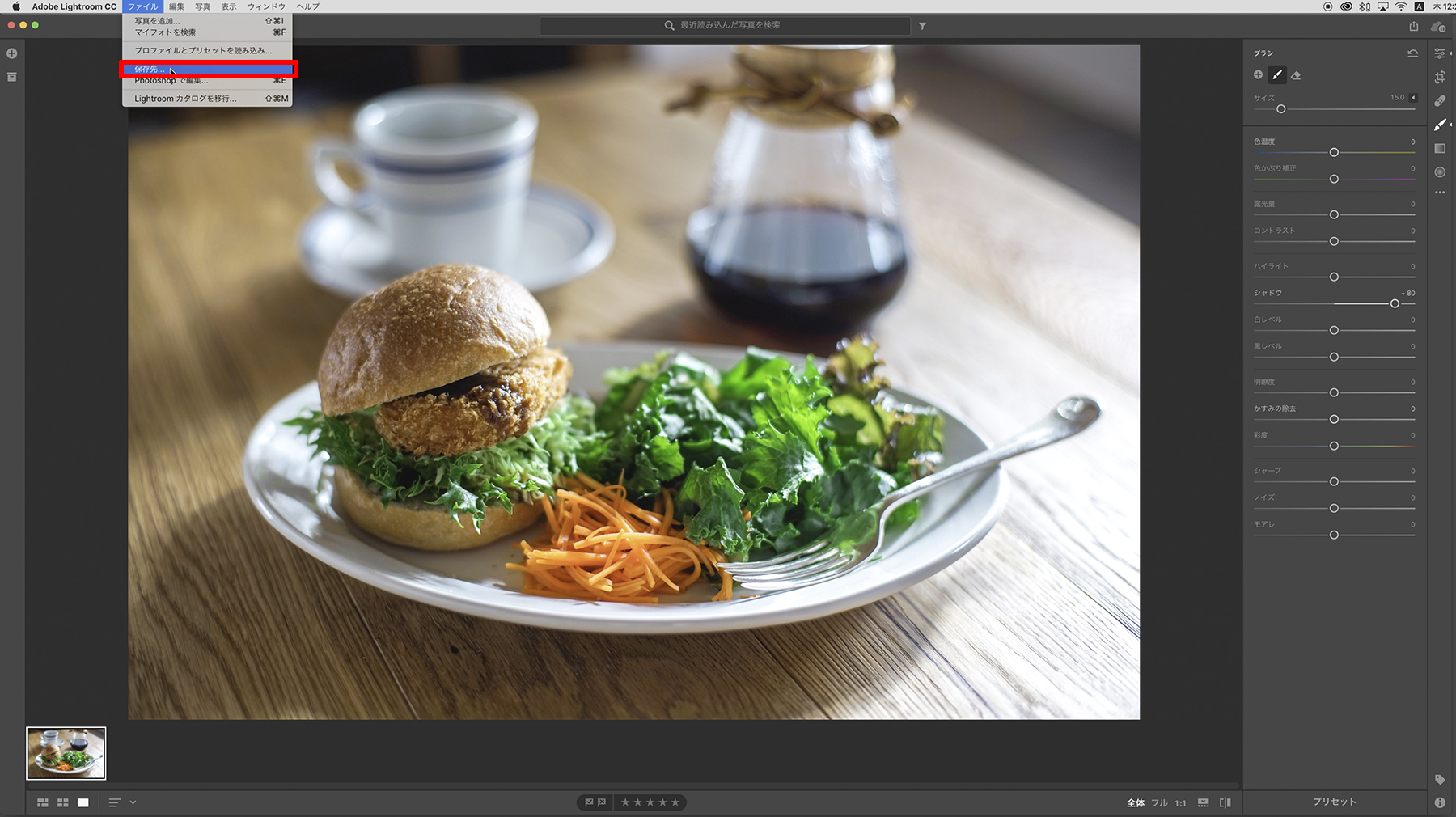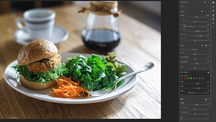 食べ物が鮮やかにおいしく見えるように彩度を上げます。