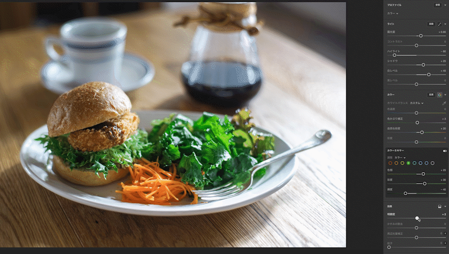 右パネルの[効果]→[明瞭度]のスライダーを右にドラッグすると、エッジの効いたより鮮明な写真になりました