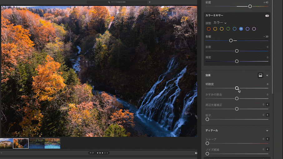 右パネルの[効果]→[明瞭度]のスライダーを右にドラッグすると、エッジの効いたより鮮明な写真になりました。