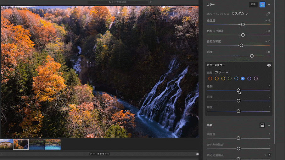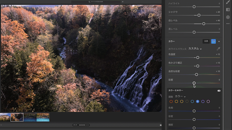 木々をさらに鮮やかに見せるために、右パネルの[編集]→[カラー]→[彩度]のスライダーを右にドラッグして調整します。