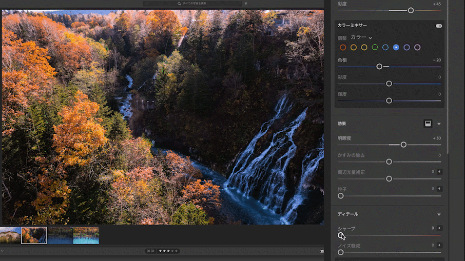 最後に、右パネルの[ティテール]→[シャープ]のスライダーを右にドラッグします。