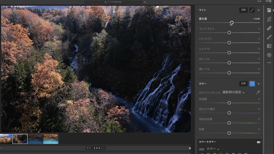 写真が暗めなので、右パネルの[編集]→[ライト]→[露光量]のスライダーを右にドラッグして調整します。
