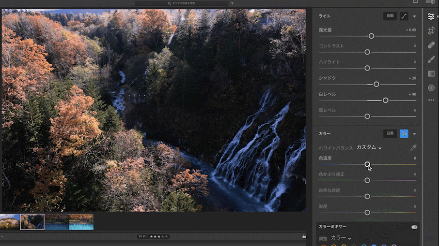 色味を調整するために、右パネルの[編集]→[カラー]→[色温度]のスライダーを右にドラッグします。