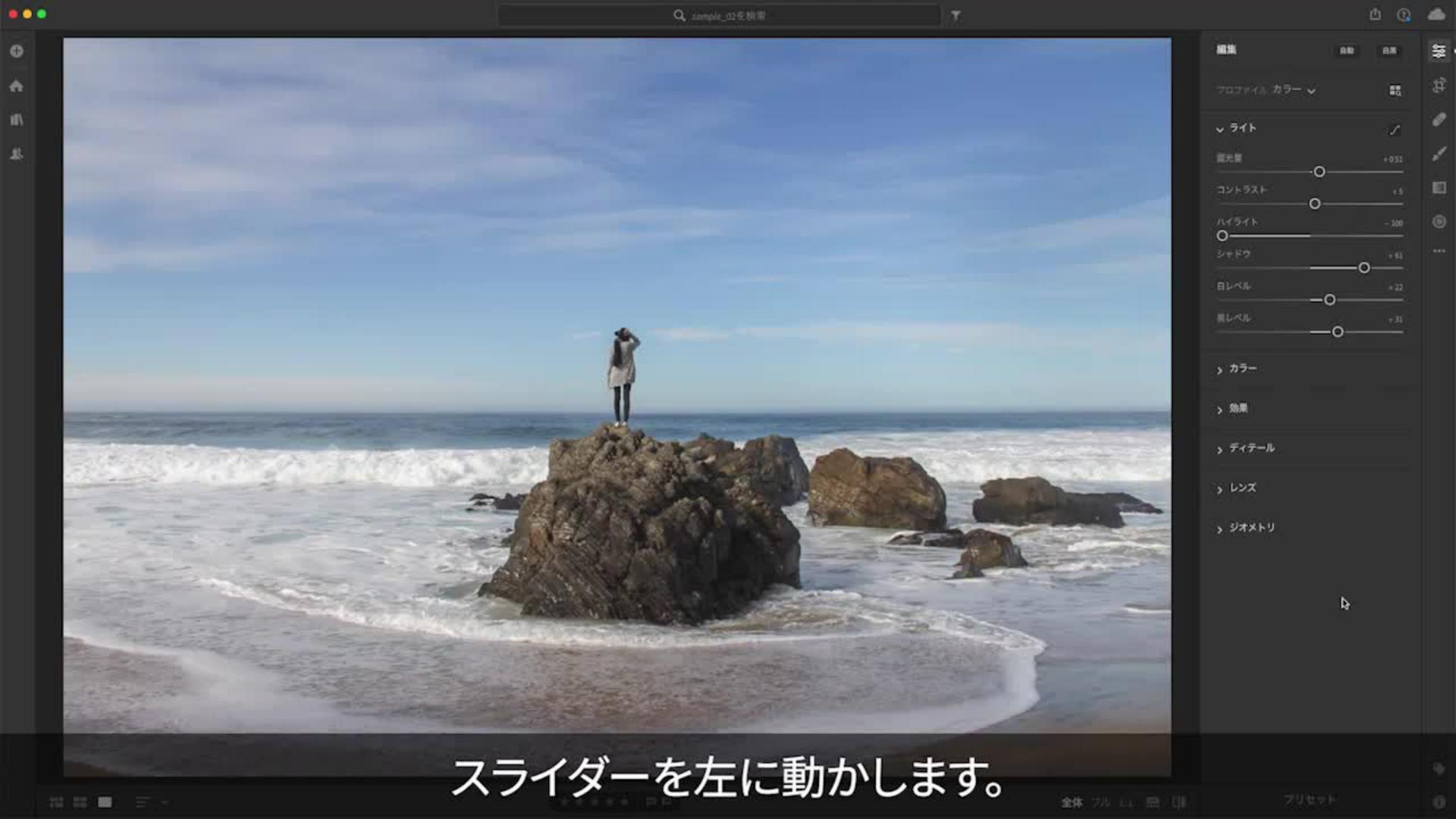 ハイライト :写真の明るい部分のみの明るさを調整します。ハイライトを暗くしてディテールを際立たせるにはスライダーを左に、明るくしてディテールを目立たなくさせるには右に動かします。