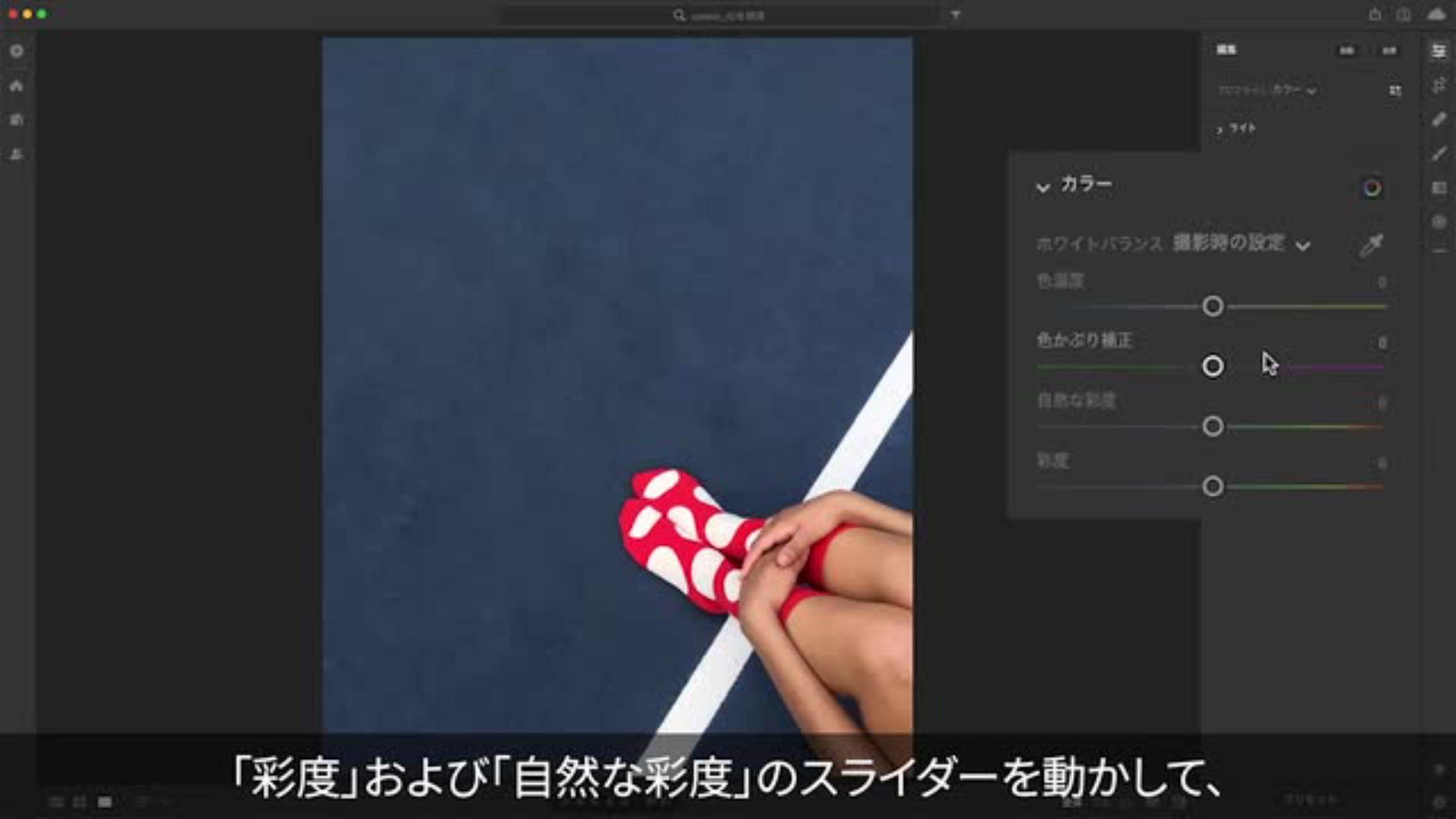 編集用ワークスペースの「カラー」パネルを展開します。写真の色かぶり、つまりホワイトバランスを手動で調整するには、色温度コントロールと色かぶり補正コントロールを使用します。