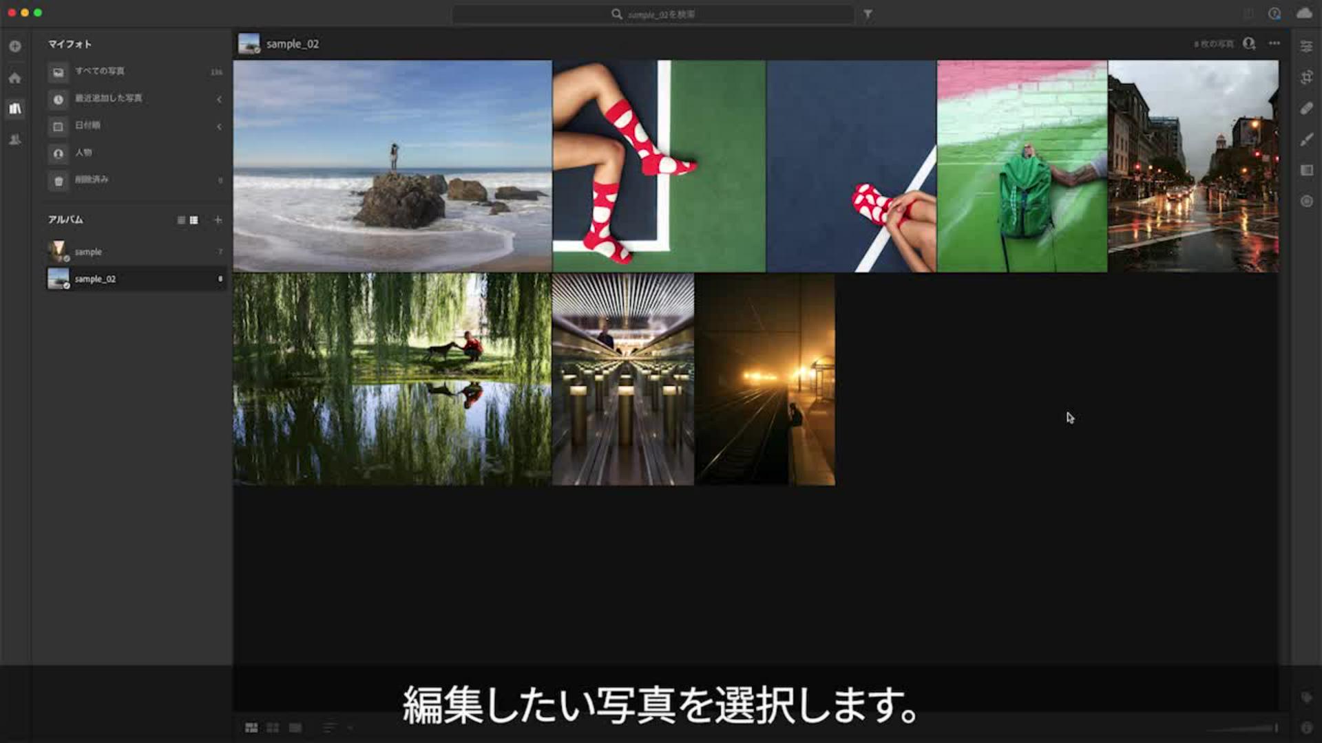 Lightroomの画面に戻ったら、画面左の「マイフォト」⑤をクリックし、新しく追加されたアルバムを選択すると、読み込んだ8枚の写真が表示されます。