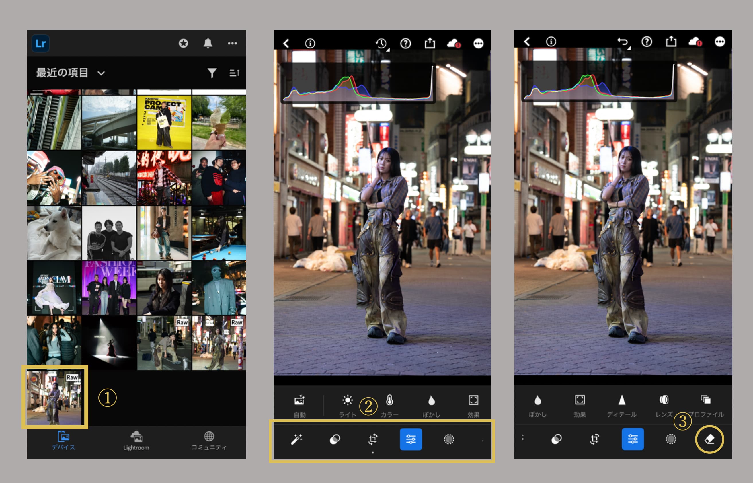 1. Lightroomモバイル版に写真を読み込み、削除ツールを選択