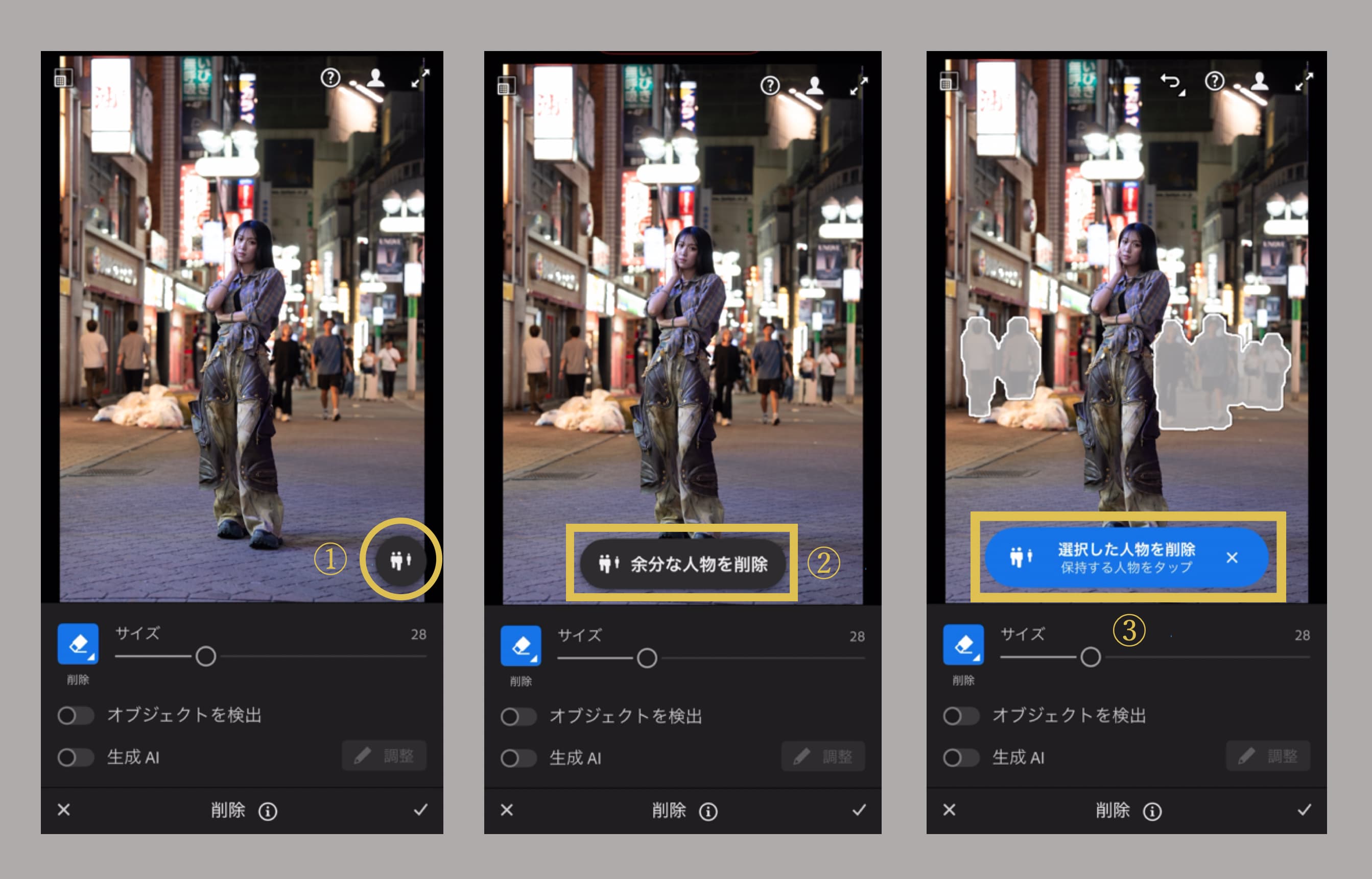 ③ 写真の下中央に表示される青いアイコン「選択した人物を削除」をタップします。しばらくすると、新たに生成された画像で人物が塗りつぶされ、背景の通行人が違和感なく綺麗に削除されます。