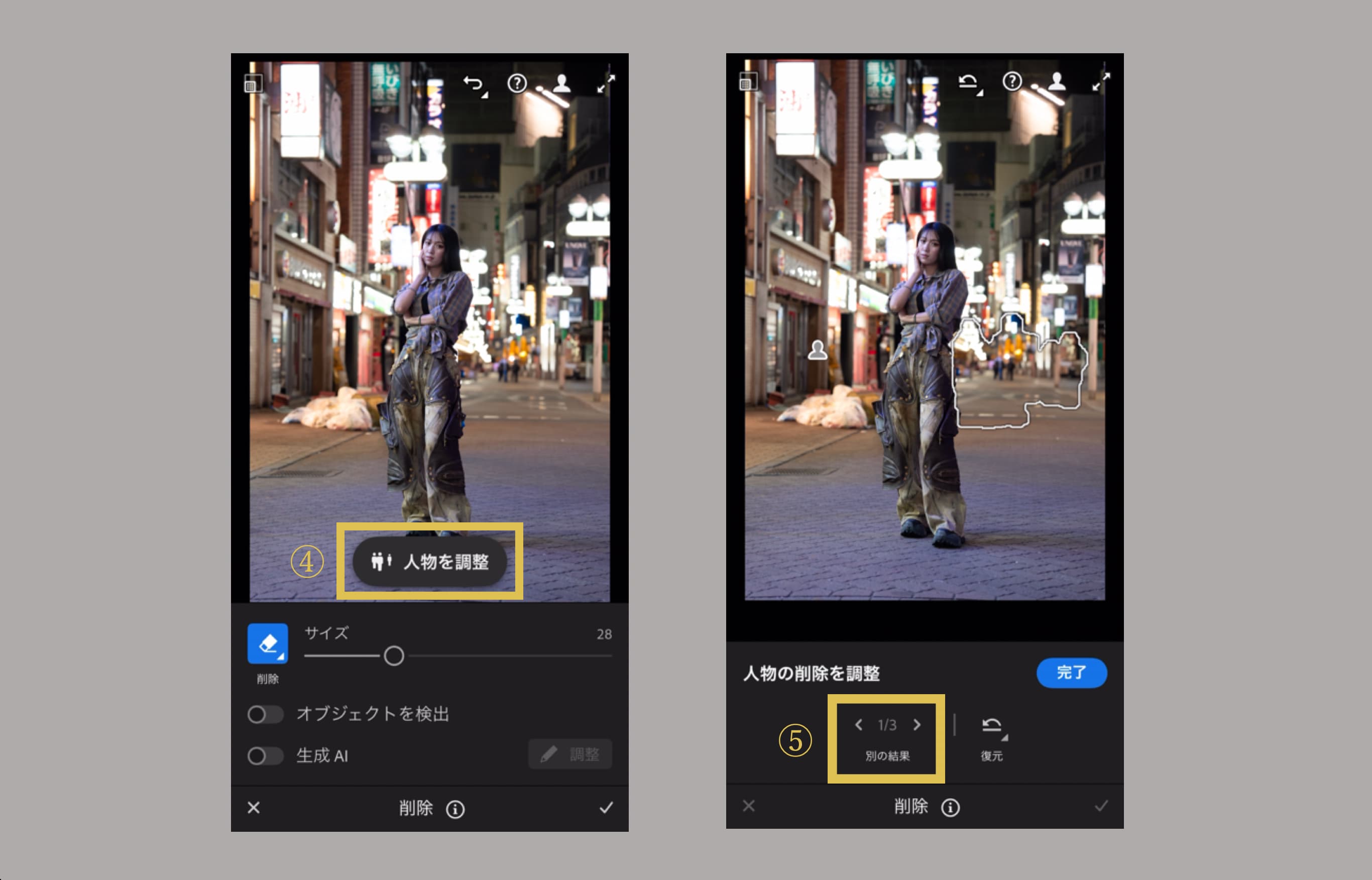 ② 手順2と同様に、右下の「調整」から選択したオブジェクトの別の結果バリエーションが確認でき、好みの仕上がりを選ぶことも可能です。