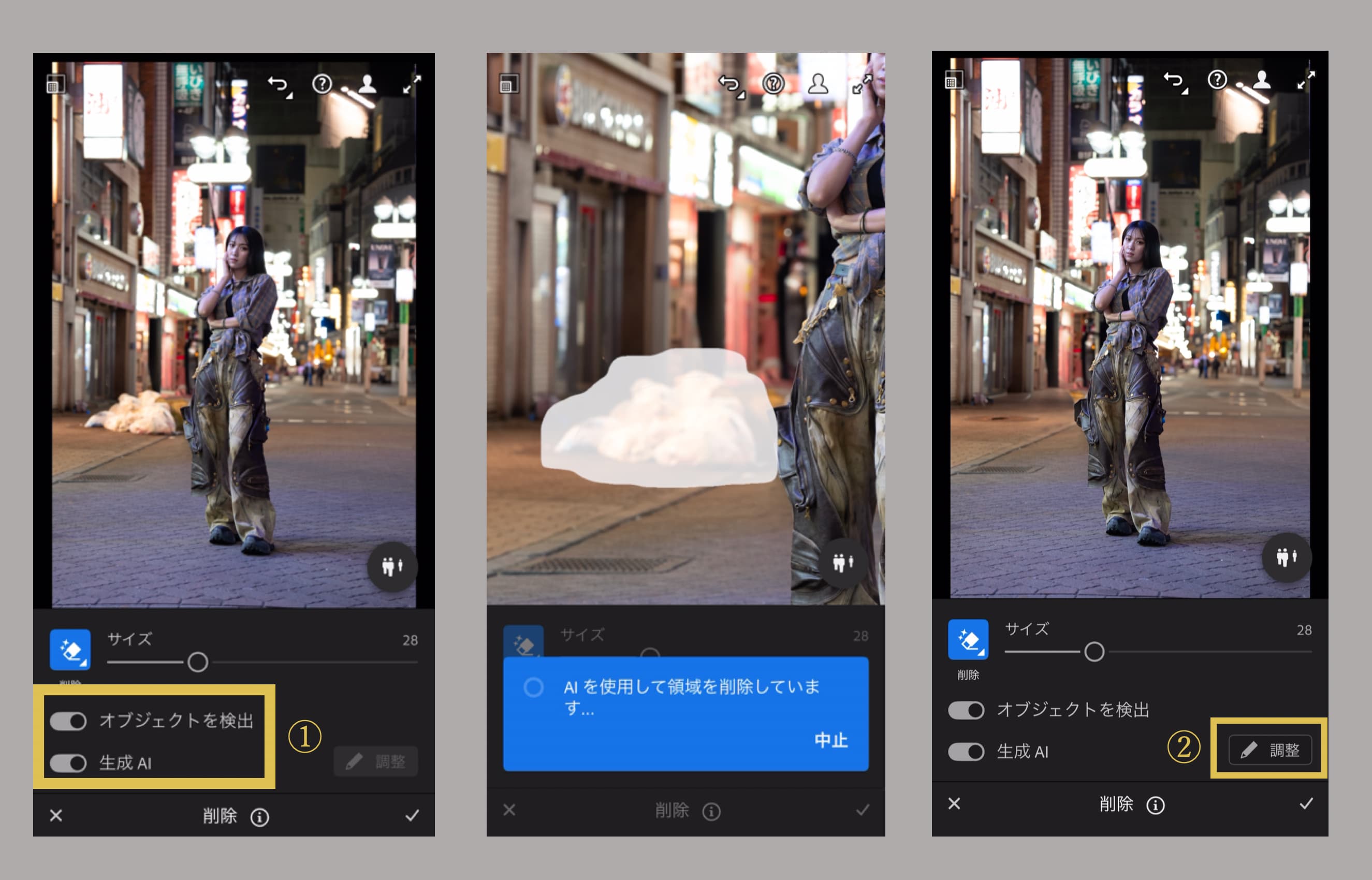 ① 削除作業画面に戻り、「オブジェクトを検出」と「生成AI」をONにします。
