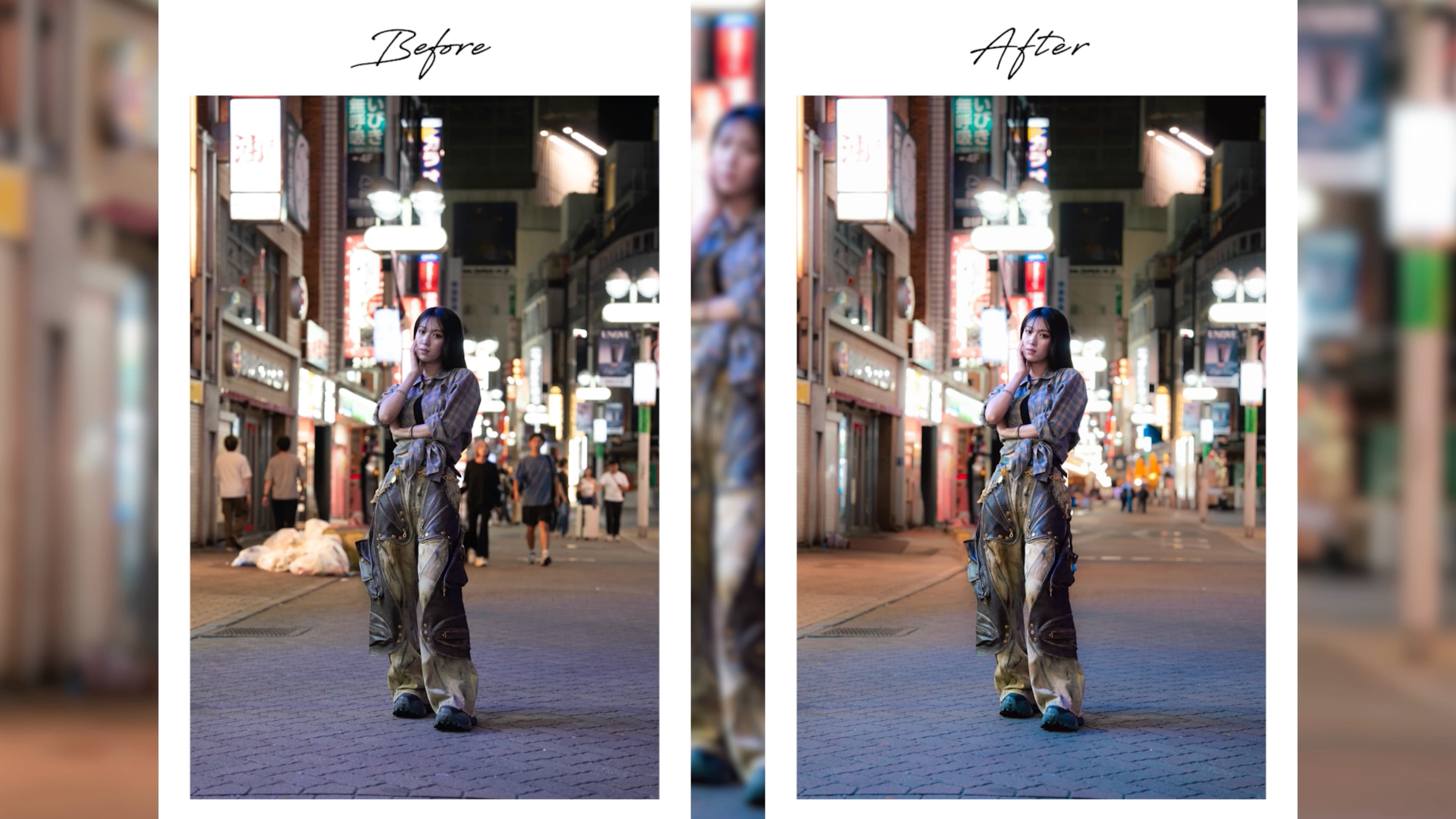 さらに光やカラーを調整することで、よりクオリティの高い仕上がりになります。こちらが編集前後の比較です。