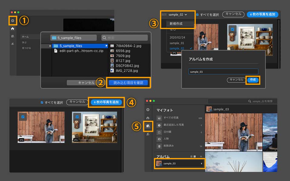 Lightroomを起動し、画面左上の「+」アイコン(写真を追加)①をクリックします。表示されるダイアログでサンプルファイル「3_sample_files」を選択し、「読み込む項目を確認」②をクリックします。