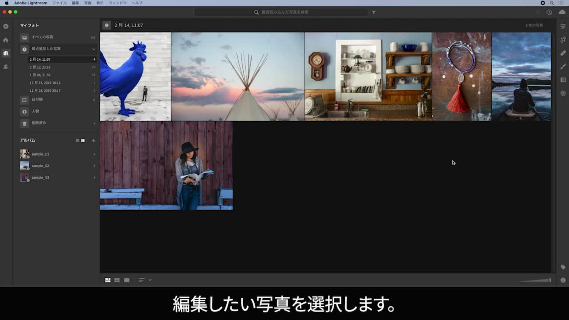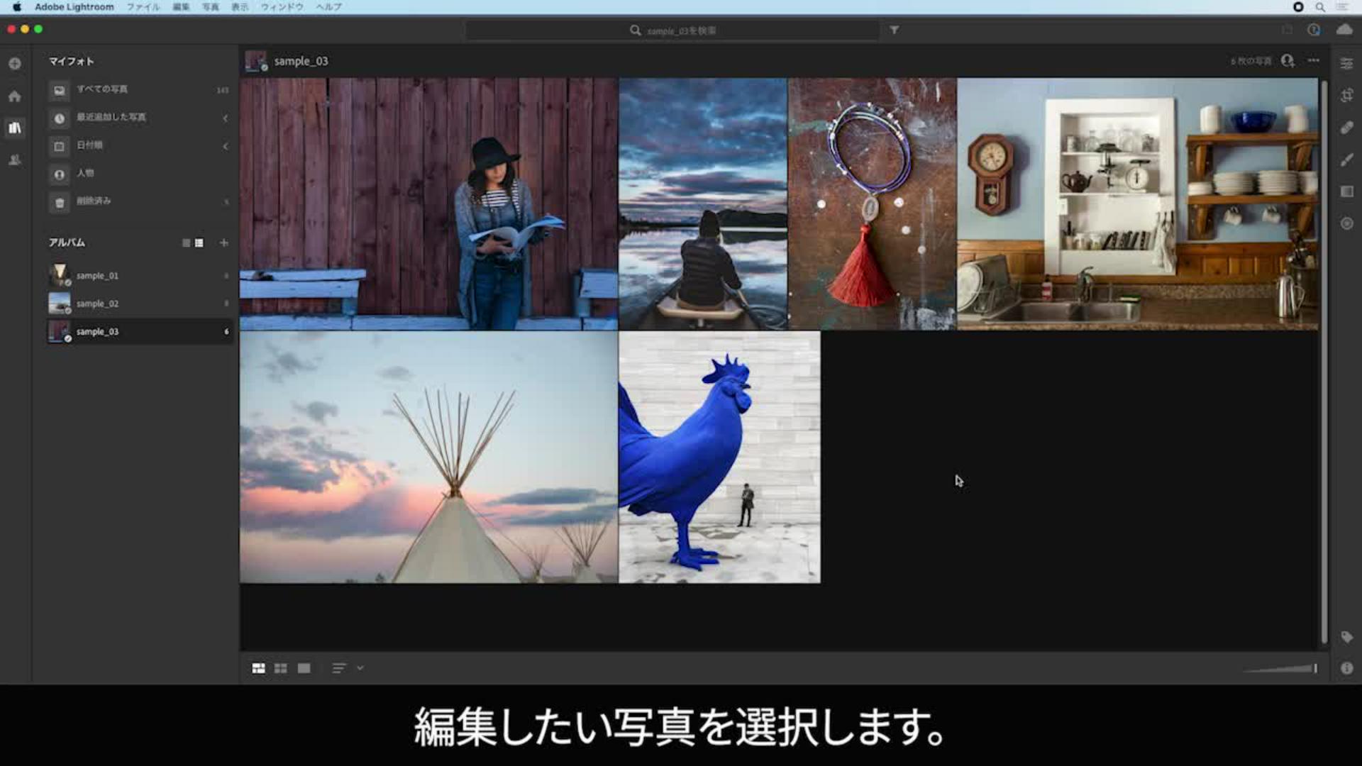 Lightroomの画面に戻ったら、画面左の「マイフォト」をクリックし、新しく追加されたアルバムを選択すると、読み込んだ8枚の写真が表示されます。