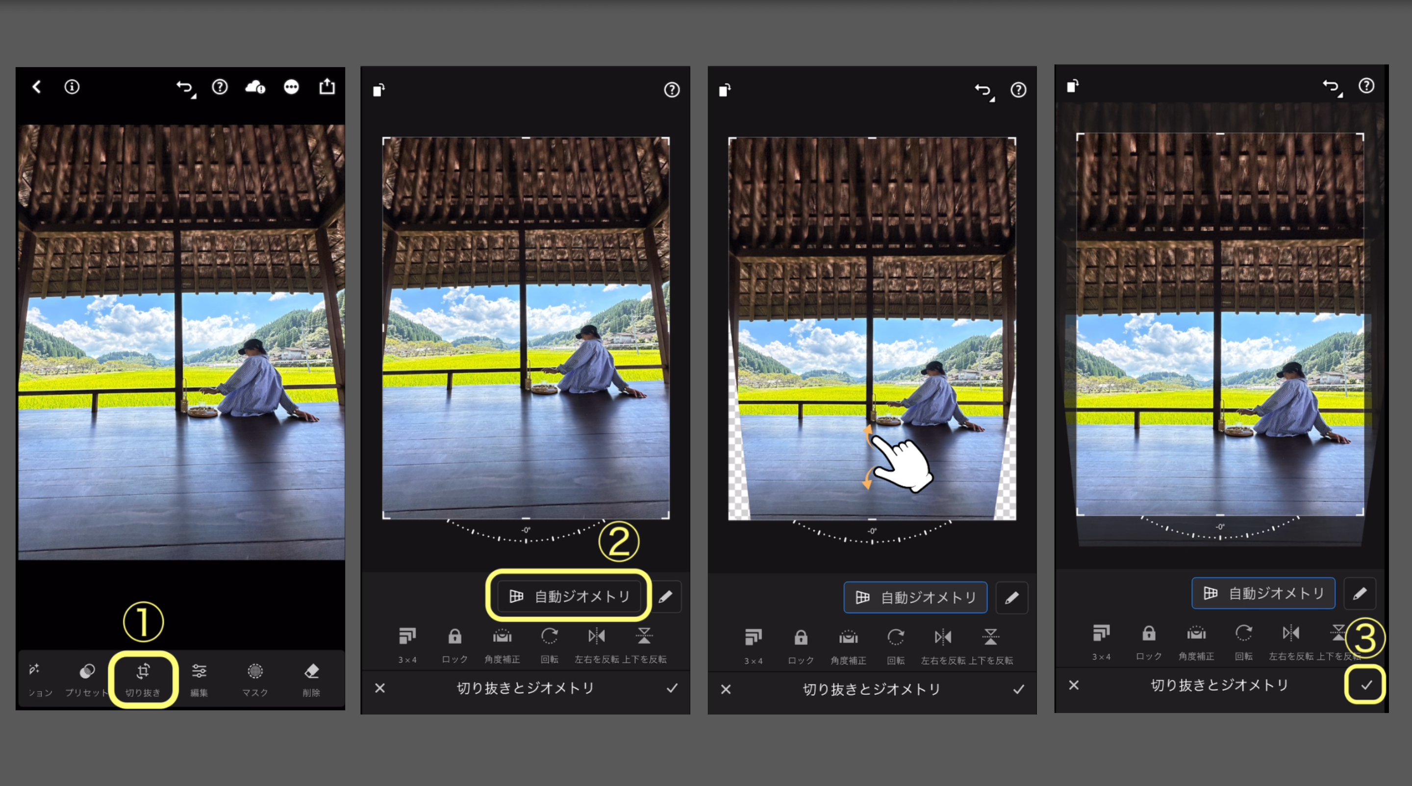 ①「切り抜き」ボタンにある、②「自動ジオメトリ」をタップします。