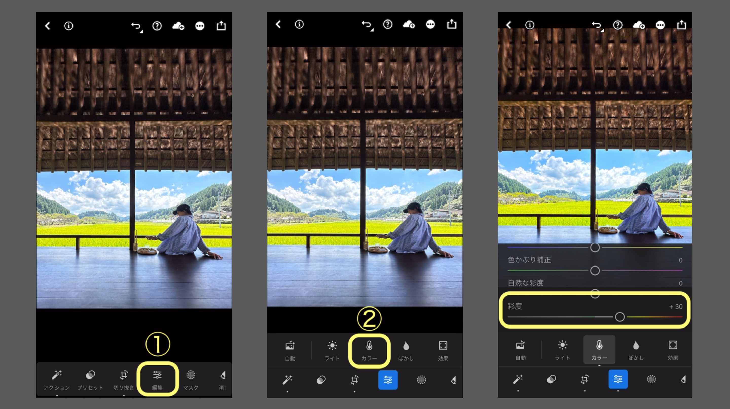 ①「編集」をタップし、②「カラー」を選択します。③「彩度」を+30動かすことで、
