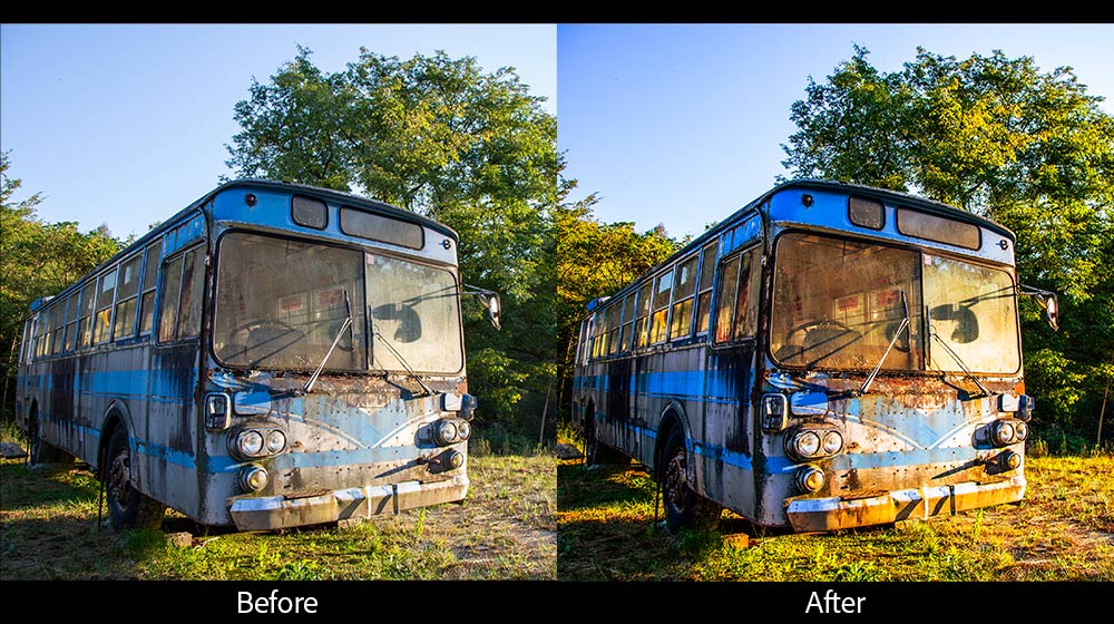 また、作例は秋に撮影した朽ちたバスの写真なので、秋の空気感と、もの寂しさも再現してみます。