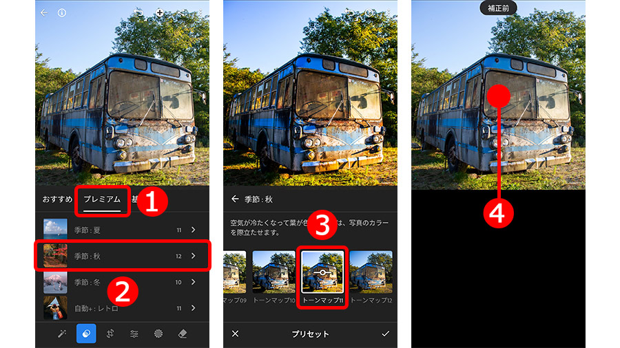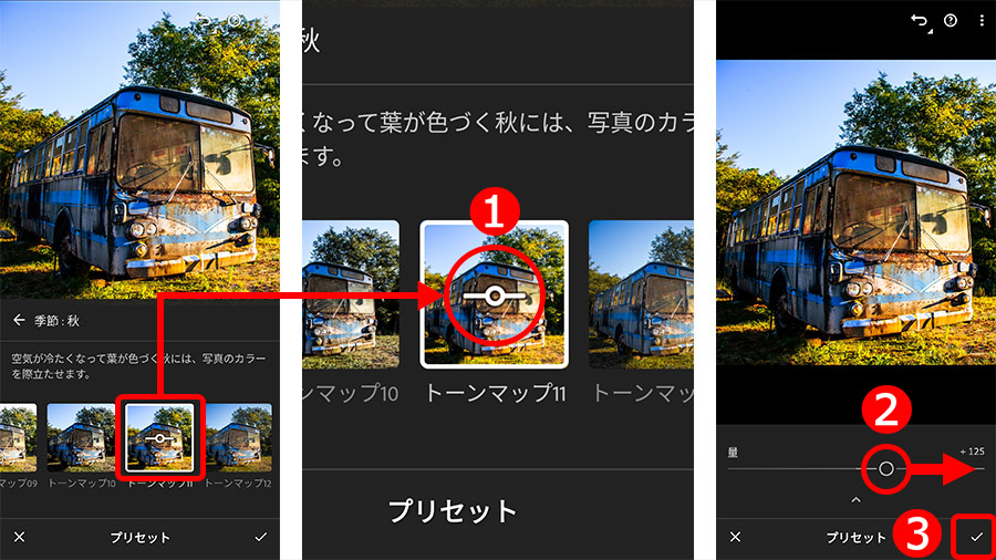 表示された「プリセット」群から、「トーンマップ11」を選択。これで写真の色が変化する