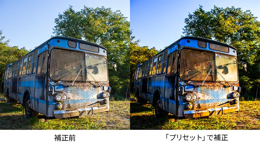 改めて、補正前と補正後の変化を確認してみましょう。左が補正前の撮影した状態で、右が「プリセット」で仕上げた写真です。