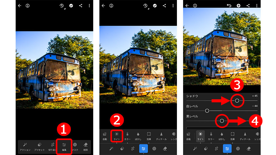 作例写真は理想よりもシャドウ部(バスの車体の陰の領域)が少し暗い印象なので、これを補正しようと思います。