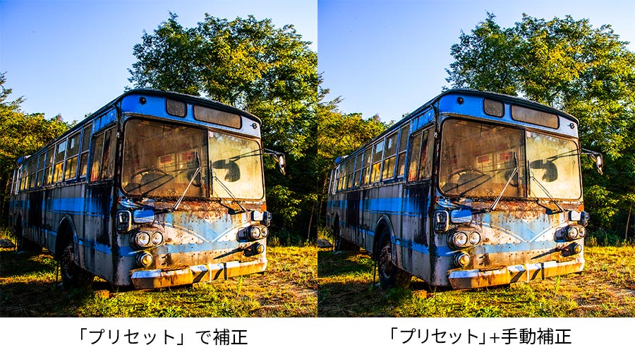 手動補正の結果を確認してみましょう。左が「プリセット」で仕上げた状態、右が「プリセット」を適用後に手動補正で仕上げた写真です。