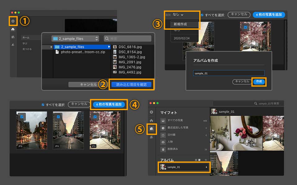 Lightroomの画面に戻ったら、画面左の「マイフォト」⑤をクリックし、新しく追加されたアルバムを選択すると、読み込んだ6枚の写真が表示されます。
