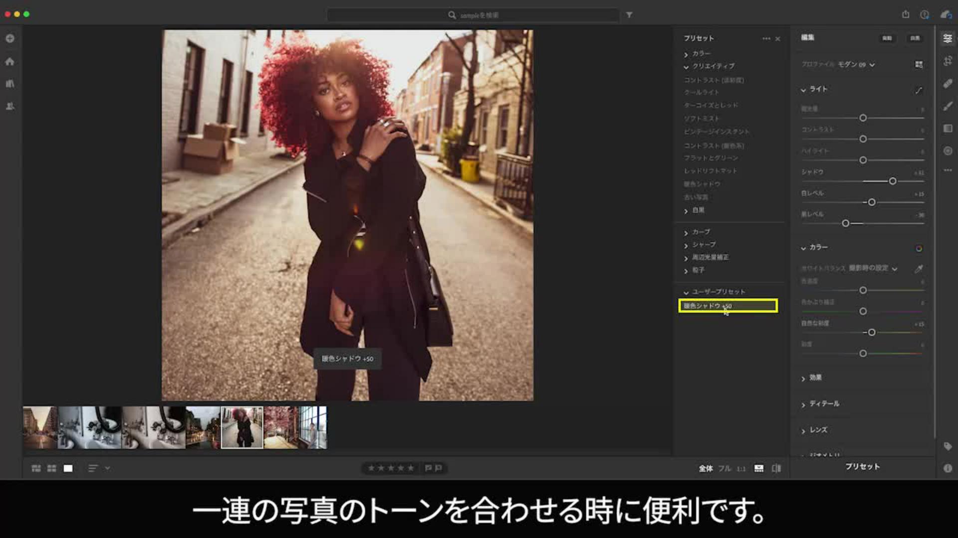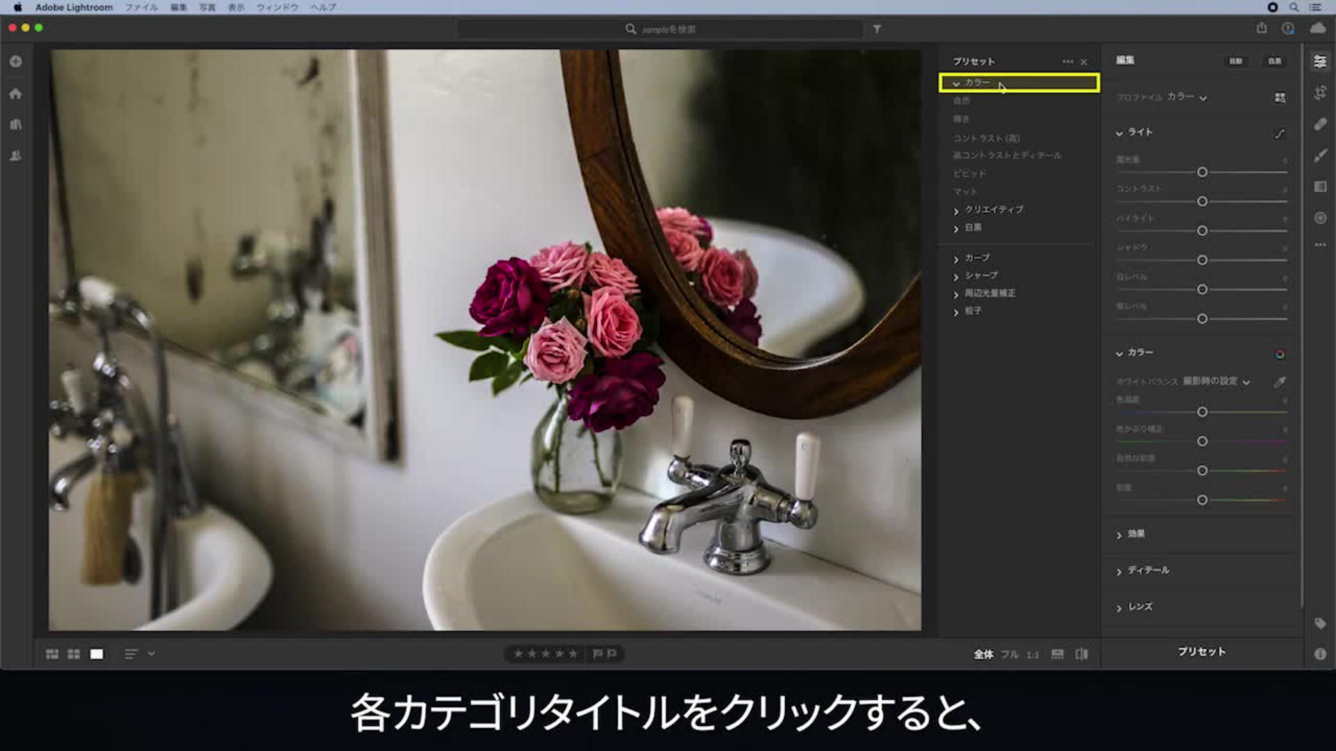 Lightroomに用意された数々のプリセットを使用して、写真の外観を1クリックで変更します。下の動画をご覧ください。