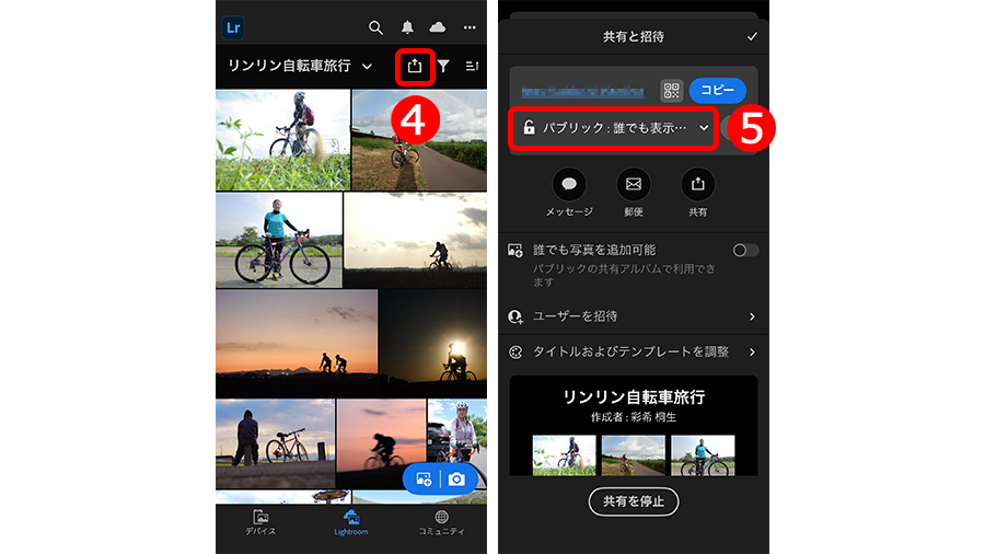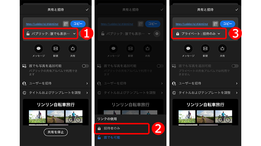 招待者のみ:Adobe IDを持つユーザーを対象に招待メールを送り、招待されたユーザーだけが、写真を閲覧したり、投稿したりできる設定です。