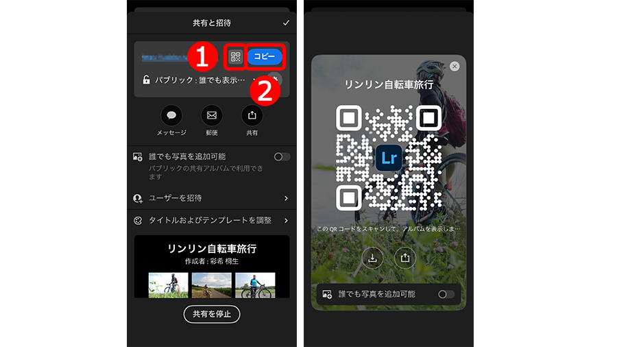 誰でも可能:閲覧者を制限することなく写真を共有する設定です。Adobe IDやLightroomのアプリを持っていないユーザーでも写真を閲覧することができます。