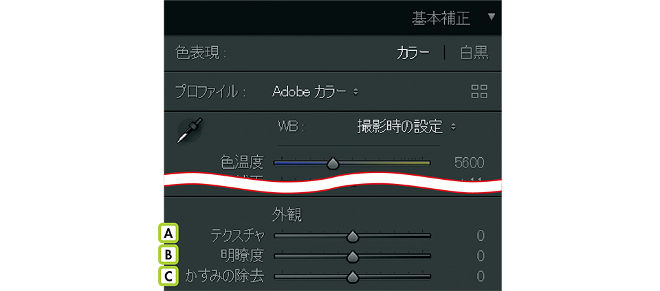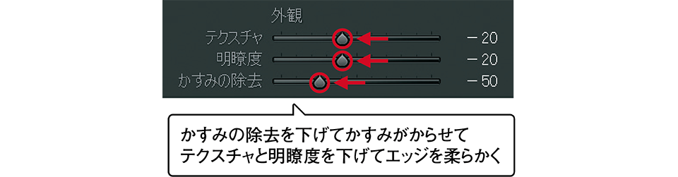 外観補正を施すことで被写体の持つディテールの調整が可能となる。硬く見せたいのか、柔らかく見せたいのか、自分の感じた被写体の「質感」を撮影後に反映する。「基本補正」の外観に関する設定は、主にディテールを調整するテクスチャ、被写体の輪郭の強弱を調整する明瞭度、画面全体の抜け感の調整が可能なかすみの除去の3つだ。カメラとレンズではなかなか調整が効かない効果であるため、外観補正は現像の醍醐味でもある。撮影時に反映することが難しいだけに、どのような結果になるのか現像結果を想定して撮影しておくと現像でその効果を得やすい。露出補正と同じく作品のイメージがガラッと変わるツールであるため意図せぬ過度な補正には注意が必要だ。