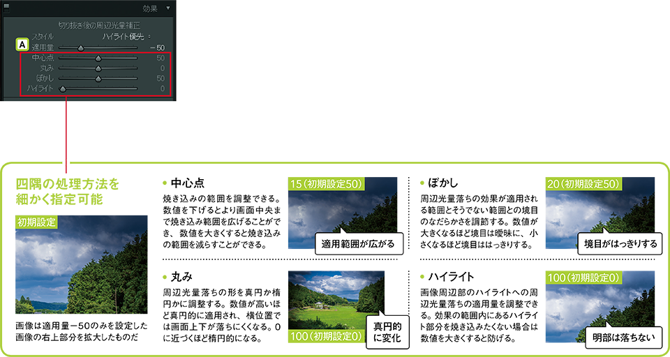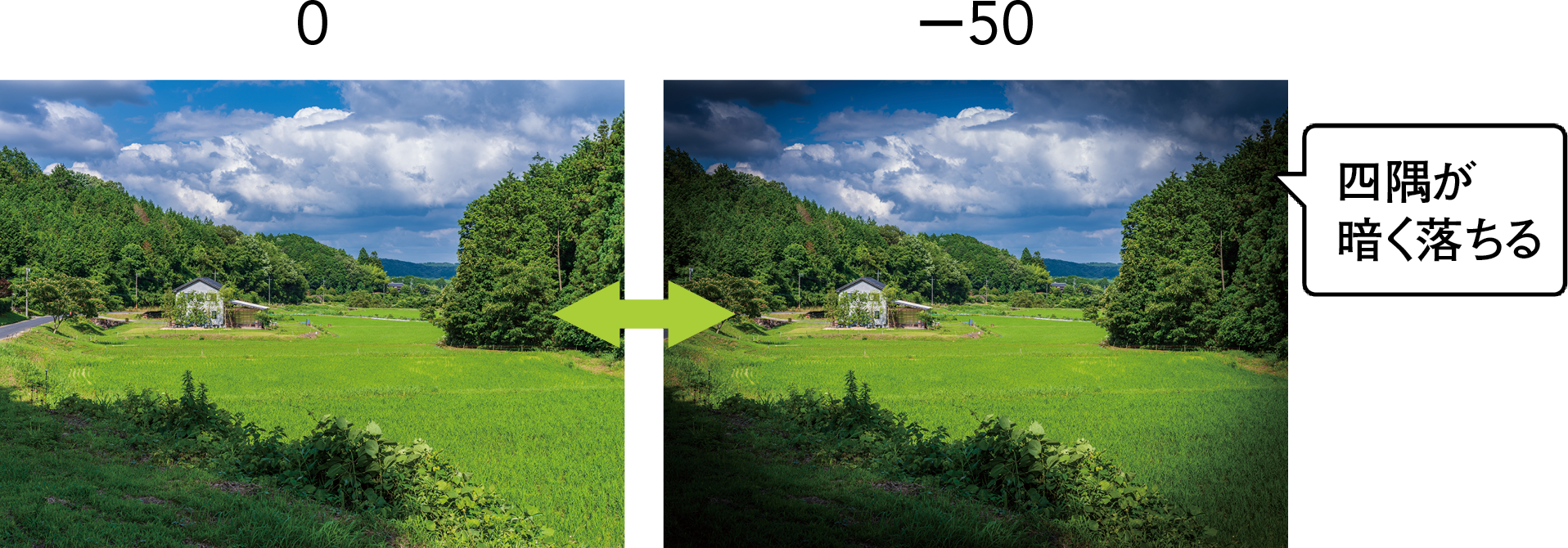 適用量を下げると周辺光量がどんどん落ちて画面の四隅が暗くなる。日の丸構図の作品との相性が良く、画面中央に視線を誘導するトンネル効果を作ることが可能だ。反対に数値を上げることで意図しない周辺光量落ちを補正したり、ホワイトエッジ効果を作ることができる。