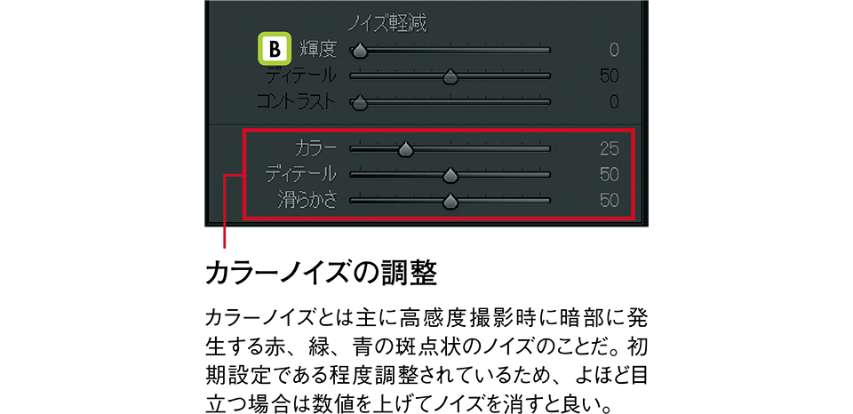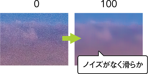 高感度撮影などで発生するザラッとしたノイズを目立たなく補正してくれる。効果を強くし過ぎると本来のディテールまで失われてしまうため程よい数値を見極めよう。