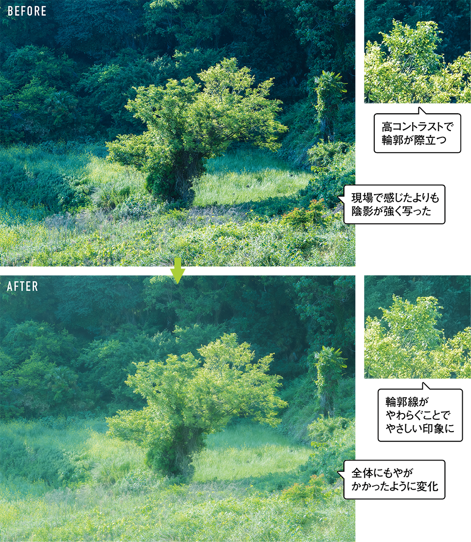 春の柔らかい日差しを浴びた木のある風景を撮影。現場で感じた春の光の柔らかさと拡散した日差しの雰囲気を3つの設定を全体的に下げて再現。かすみの除去を下げることでもやがかかったような空気感を再現でき、全体にソフトな質感を演出できる。加えてテクスチャと明瞭度を下げることでエッジが少しにじむため、柔らかな印象に仕上がる。