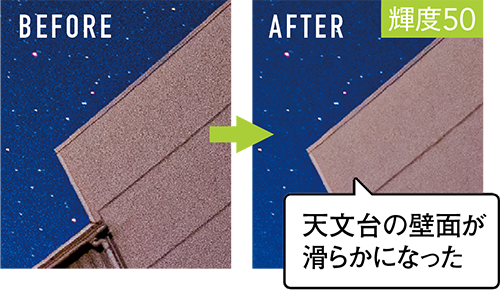 露出アンダーで撮影した画像を現像で露出を上げた際はシャドウ部にノイズが発生しやすい。ノイズ軽減を使い、星が消失せず天文台のディテールが失われないように数値を調整した。