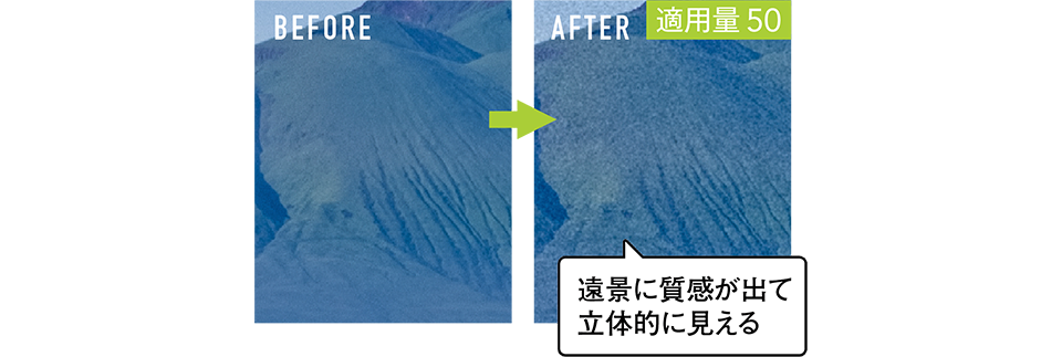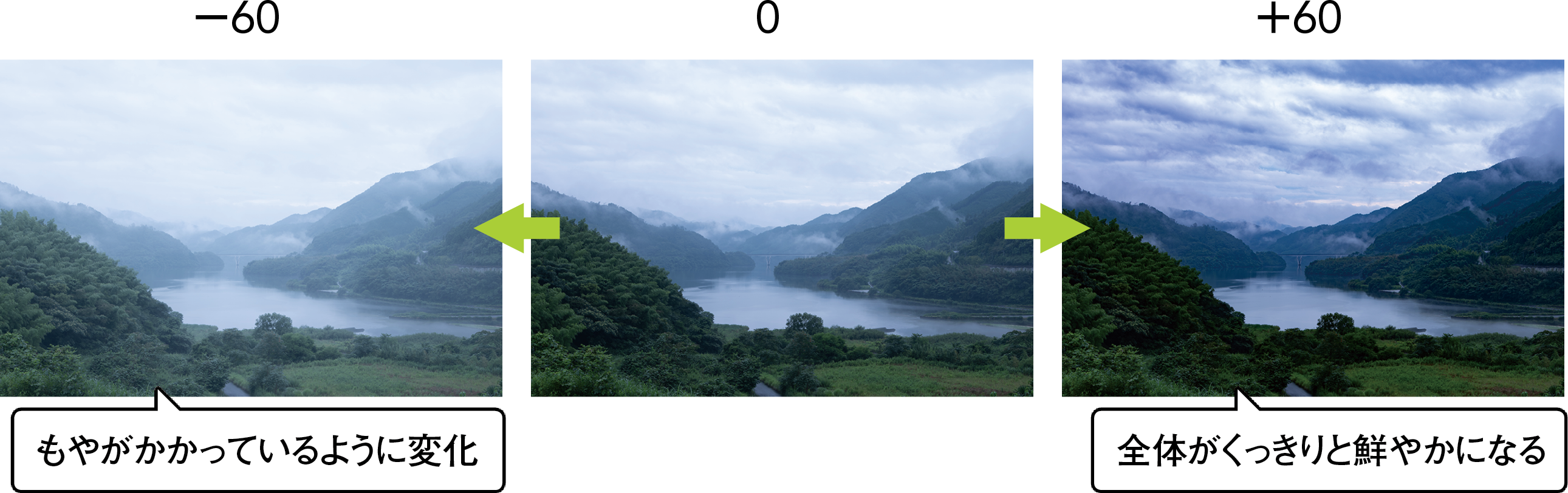 その名の通りかすみを取り除く効果を得られる機能で、大気の状況が良くない中で撮影した画像でも補正を加えることで、抜けの良い1枚に仕上がる。反対にマイナス補正をすることで意図的にもやをかけたような1枚に仕上げることもできる。変化量が大きいので大胆な調整には注意が必要となる。