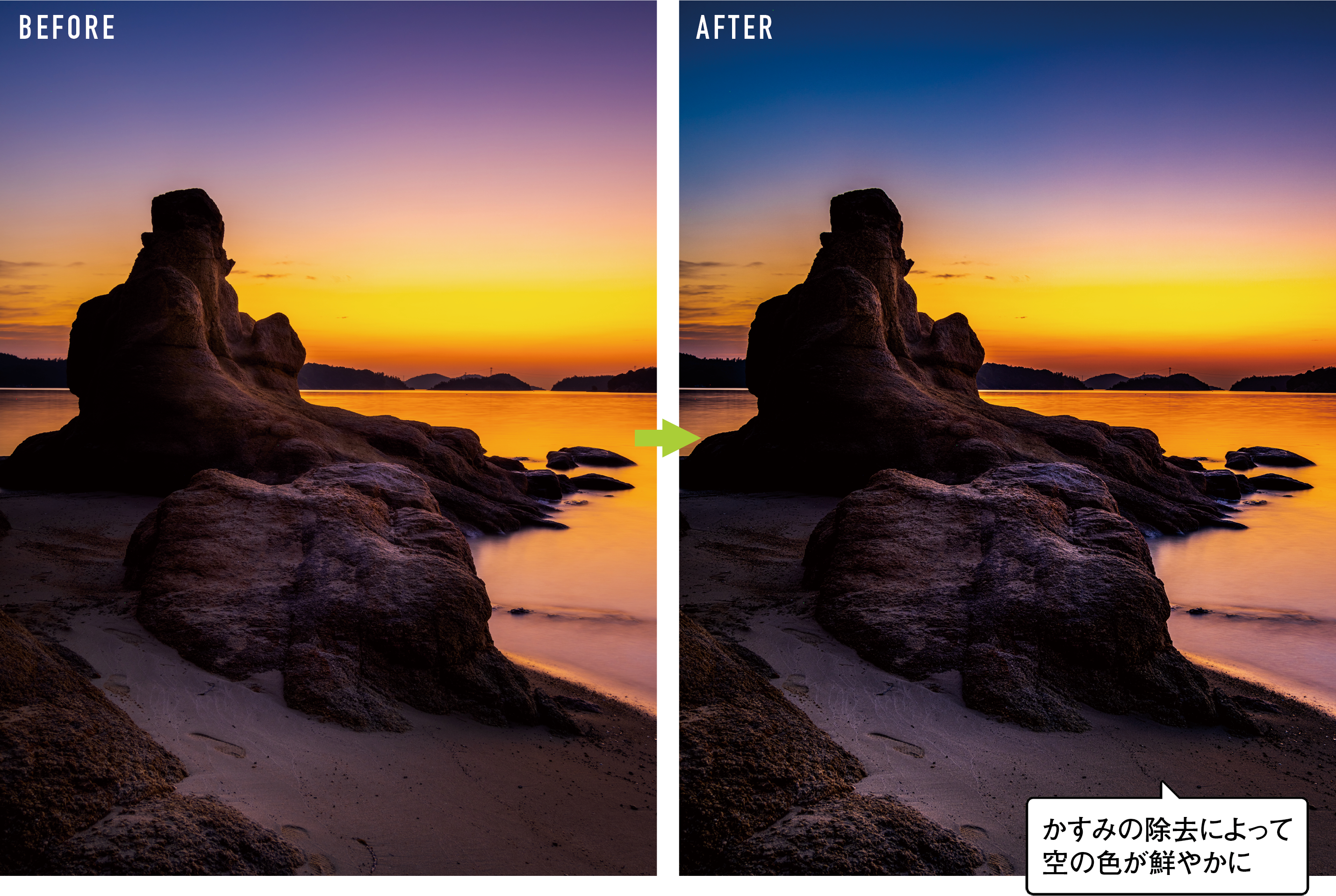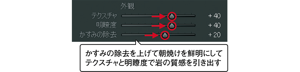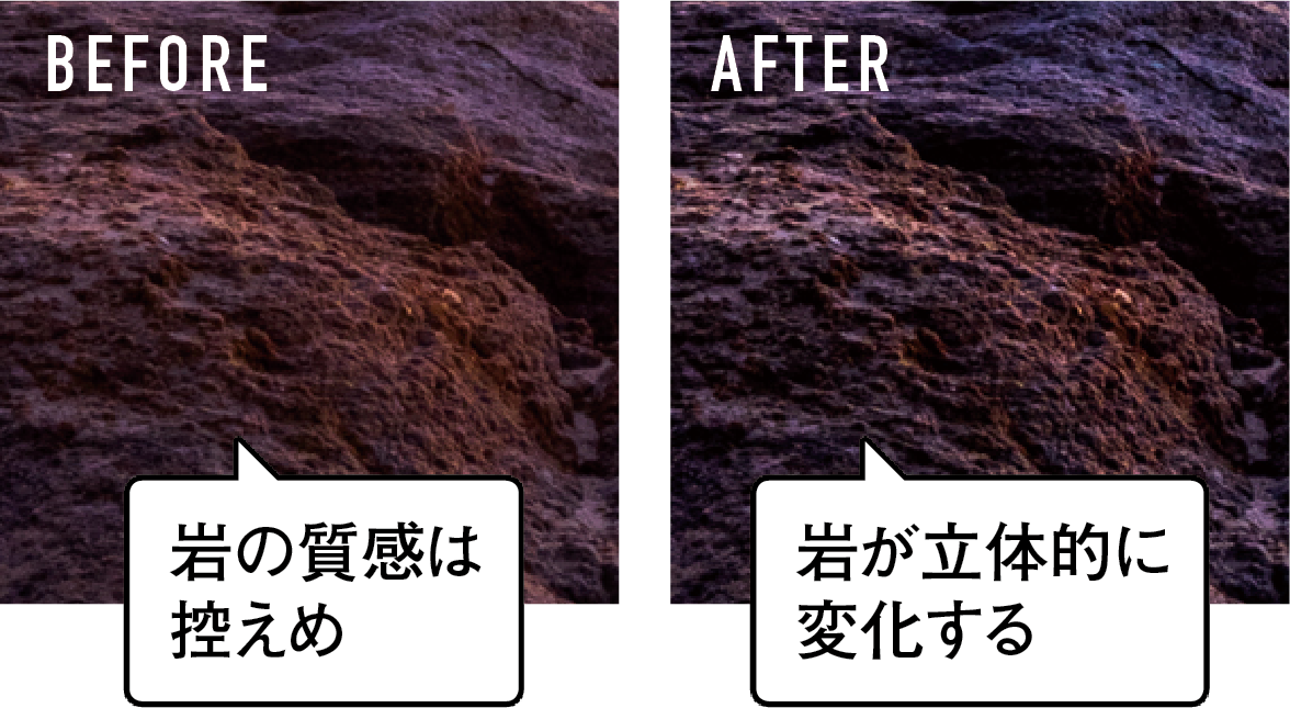 朝焼けに染まった海辺の岩のディテールを強調する。かすみの除去を使い朝焼けのグラデーションを鮮明にし色のコントラストを高める。その後、テクスチャと明瞭度を上げて岩肌の細かなディテールを強調した。岩の硬さとザラっとした手触りの質感を再現でき、立体感も増している。