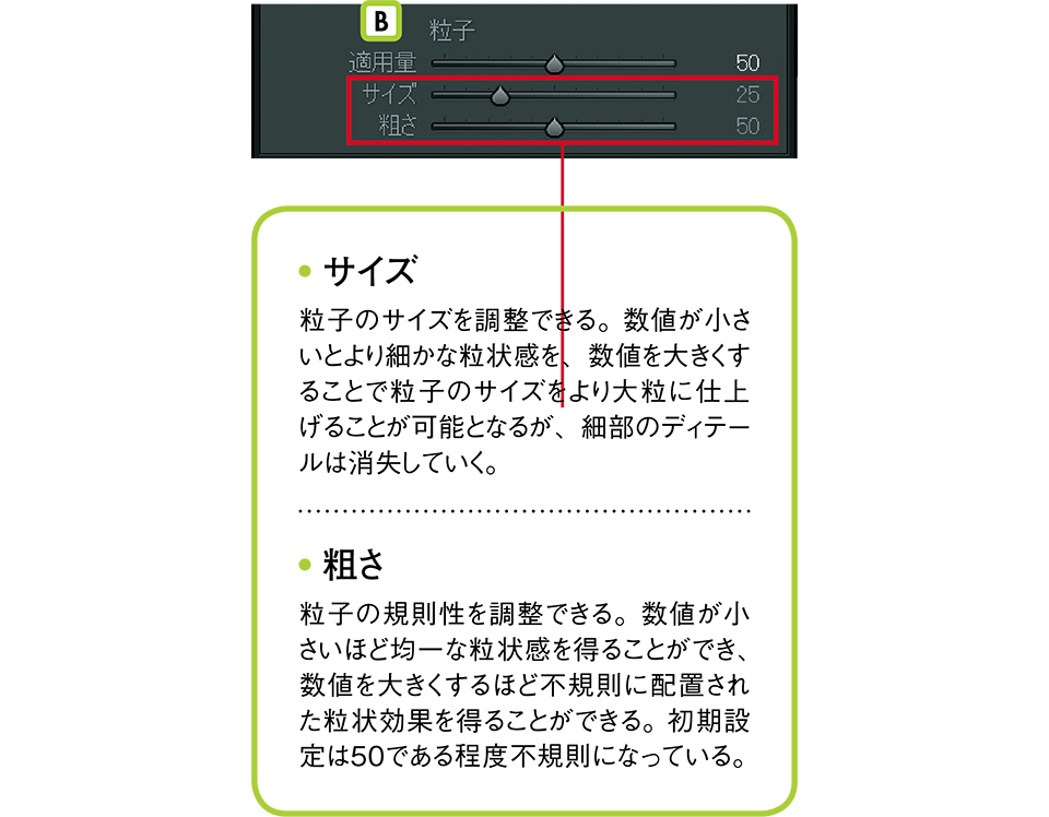 粒子の適用量を上げることで意図的に画像に粒子を加えることができる。少し懐かしさを感じさせるフィルムライクな質感や高感度で撮影したときのざらっとしたノイジーな質感を再現できる。