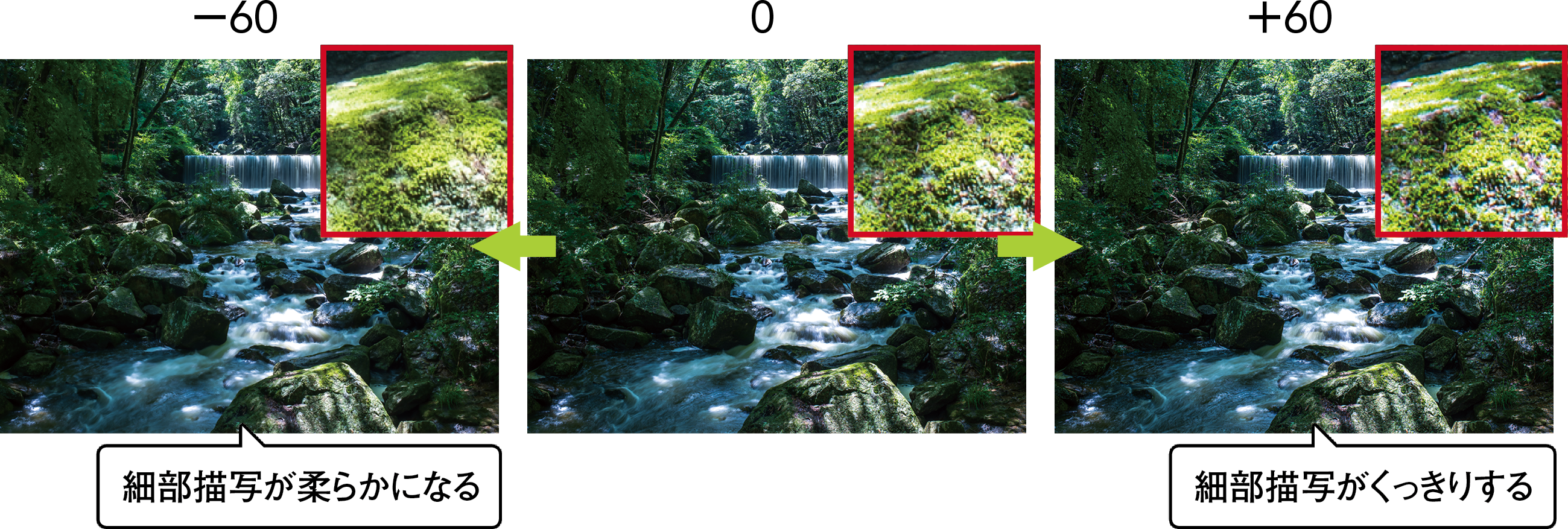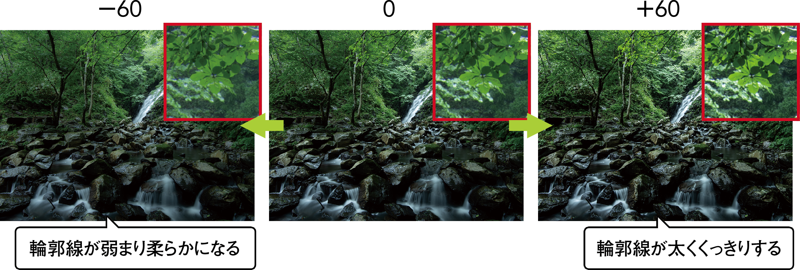 被写体のエッジ部分にかかるシャープの適用量を調整できる。数値を上げると輪郭が強調されるがノイズの発生の原因ともなる