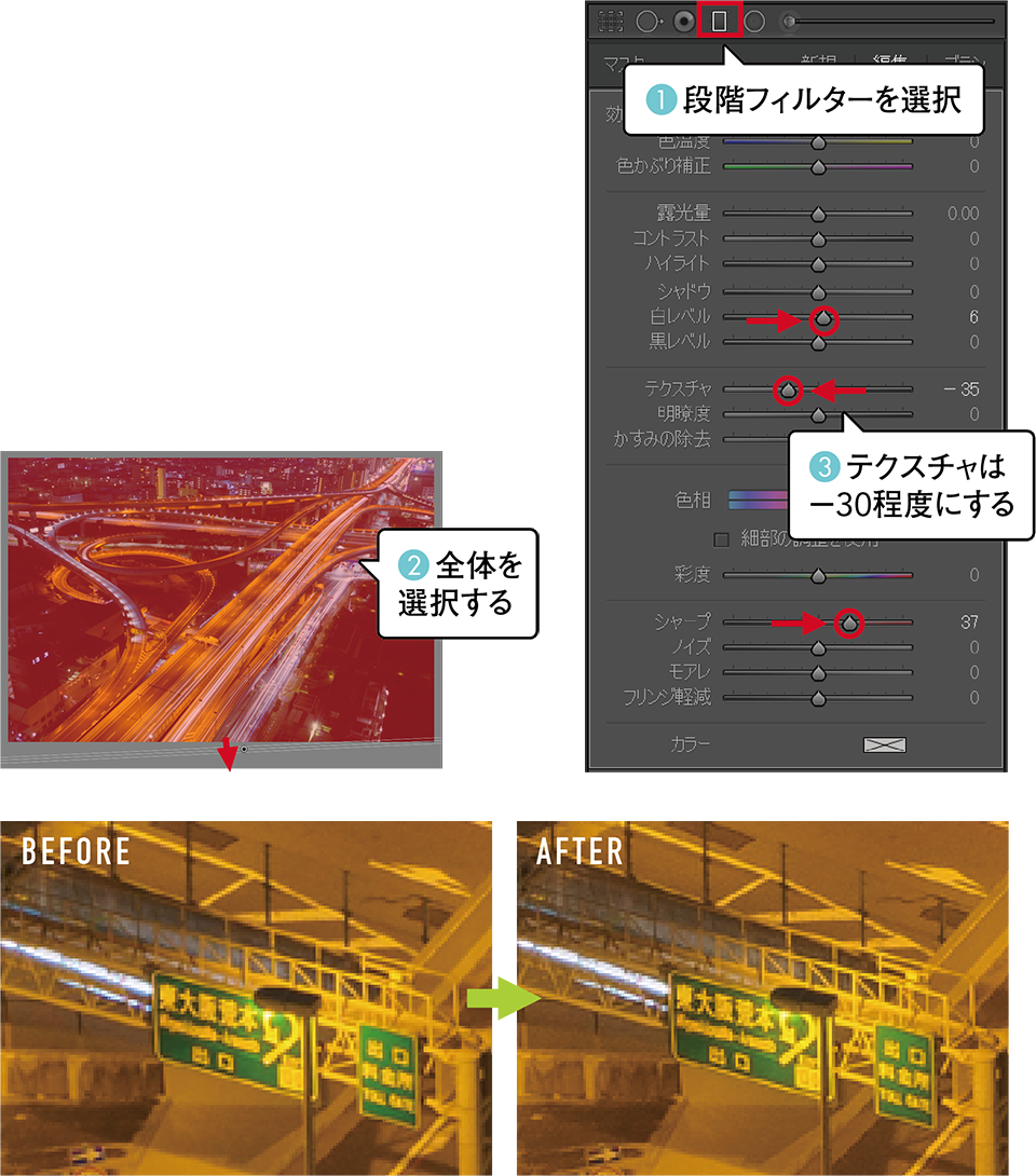 都市夜景はキラキラと光り輝き美しいのだが、垂直に立ち並ぶコンクリートの建物が多いせいかどうしても硬く重たい。そこで「段階フィルター」で写真全体を選択してテクスチャを下げることでほのかにぼかす。「段階フィルター」を使用したのは効果のオン/オフが確認しやすいから。シャープと白レベルをアップすることで都市夜景の質感を残しつつ柔らかさと輝きを持たせる。