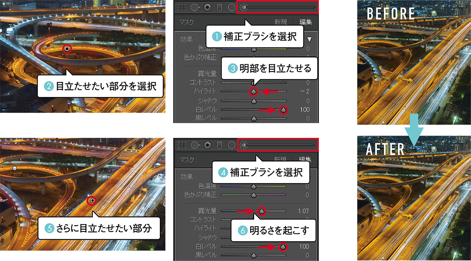 ジャンクションの輝きを補う。左側のうねったハイウェイをなぞり、ハイライトを下げて白レベルを+100にする。ハイエストライト部分をさらに明るくすることできらびやかさが増す。次により目立たせたい中央付近のハイウェイをなぞる。こちらは露光量と白レベルをアップ。明るさをプラスすることで、こげ茶色の道路と光跡の明暗差が強調されてメリハリが生まれる。