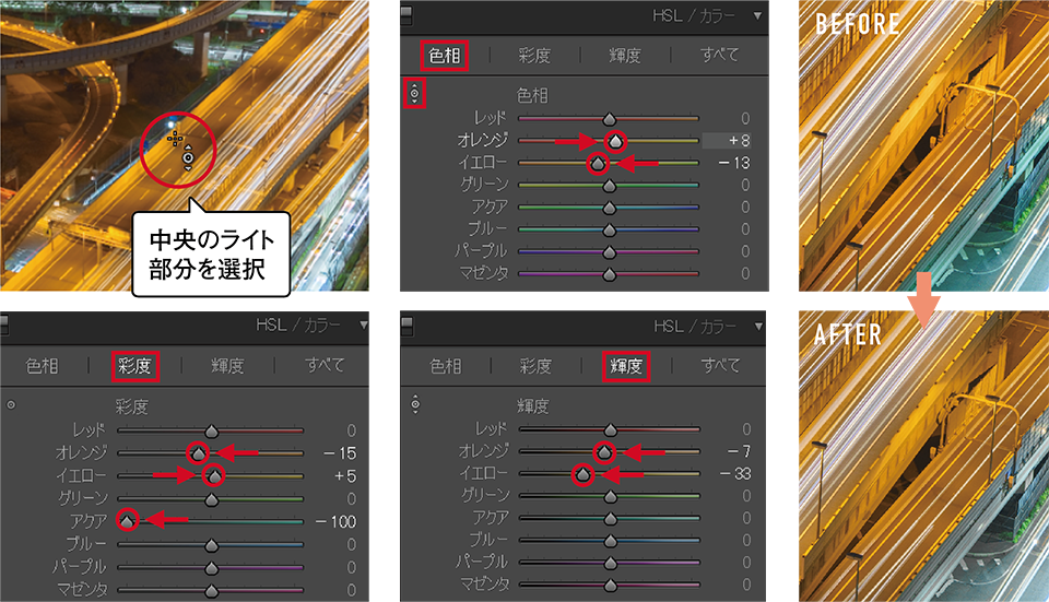 アクアの彩度を下げて青みを抜き、メインとなるジャンクションのオレンジ色を調整する。ターゲット調整ツールで写真中央のライトにカーソルを合わせた状態で、上下に動かして調整する。イメージよりもオレンジ色が強いと感じたので、色相を少しイエローに寄せた。その結果、くどいように感じたので彩度を落として落ち着かせてから輝度を下げてオレンジ色のバランスを整えた。