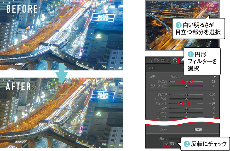 右奥の街明かりが青みを帯びていて主題である高速道路のジャンクションのじゃまになっている。そこで全体になじむように円形フィルターで青みがかっている場所全体を選択し、色温度を上げて黄色をプラスする。目立つ明るさはハイライトを抑えて調整する。色温度は画像全体の色が変化するので、全体をしっかり見ながら調整のし過ぎに注意したい。