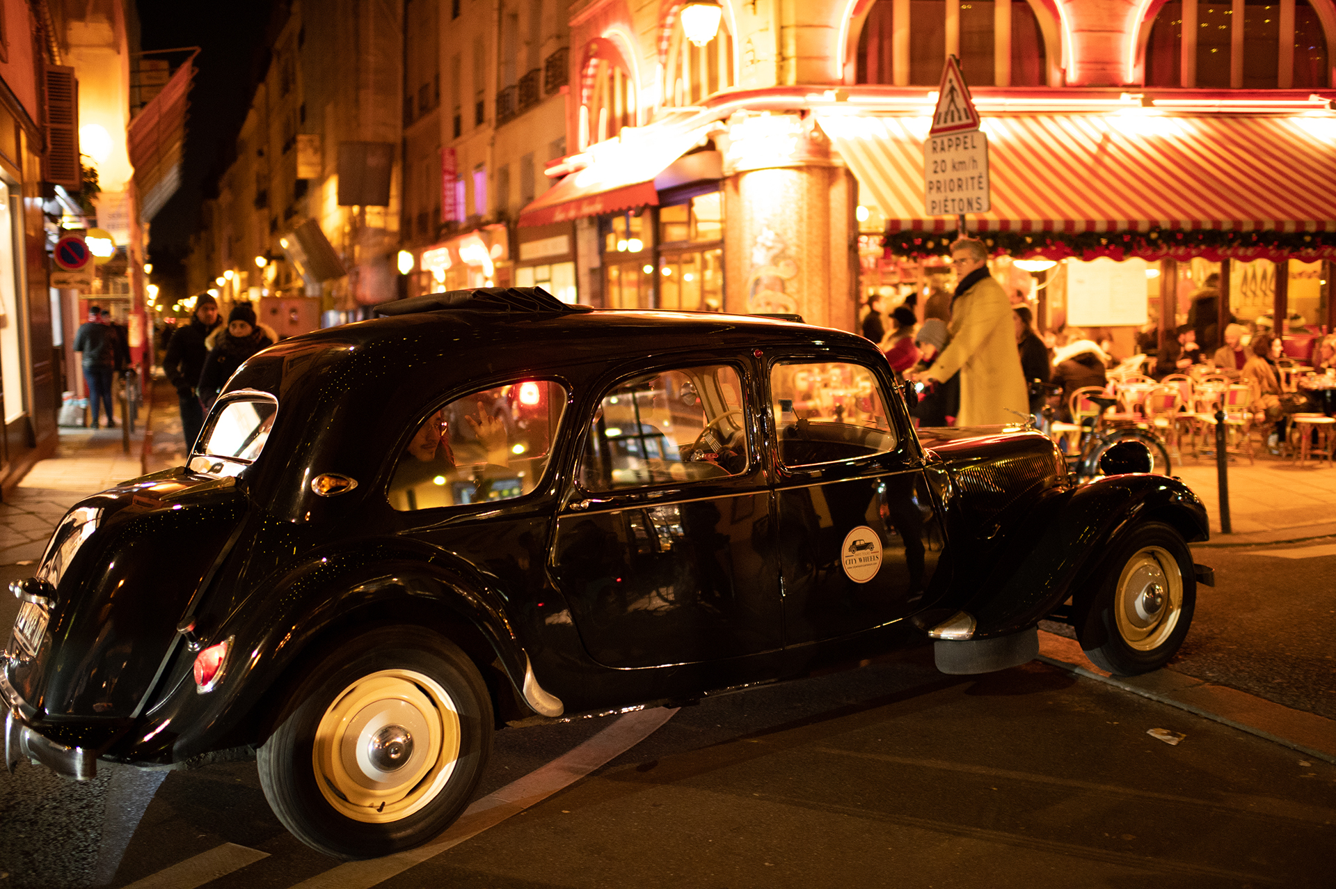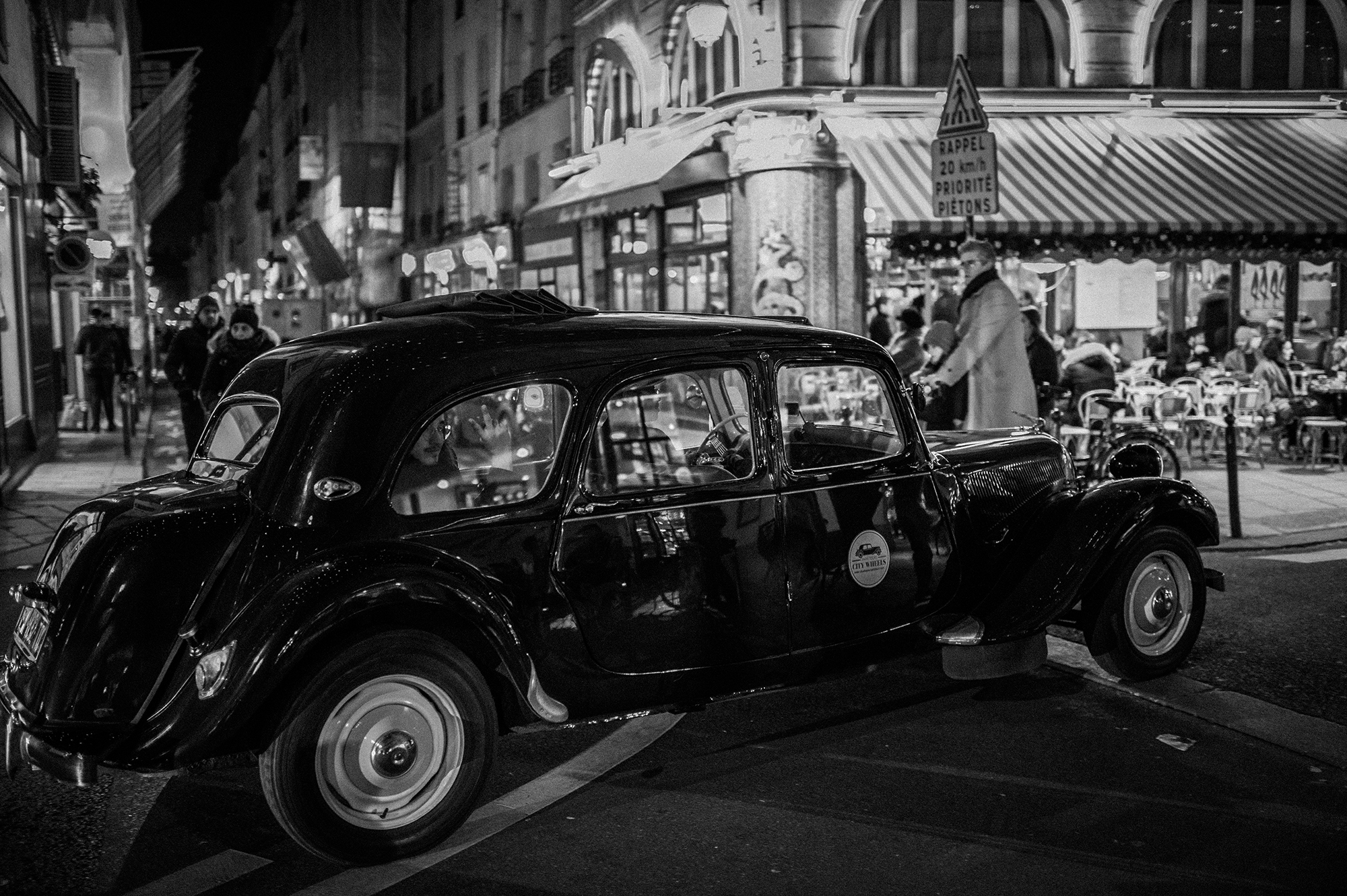 撮影画像では背景の建物に照明が当たっており、テントが白飛びをしている。カラーではあまり気にならないが、モノクロにすると明部が目立つため気になってくる。また、主題は黒いクラシックカーなのでディテールがつぶれないように注意しながら、車の艶も一緒に表現する必要がある。色ごとのトーンをしっかりと調整していくことがポイントとなる。