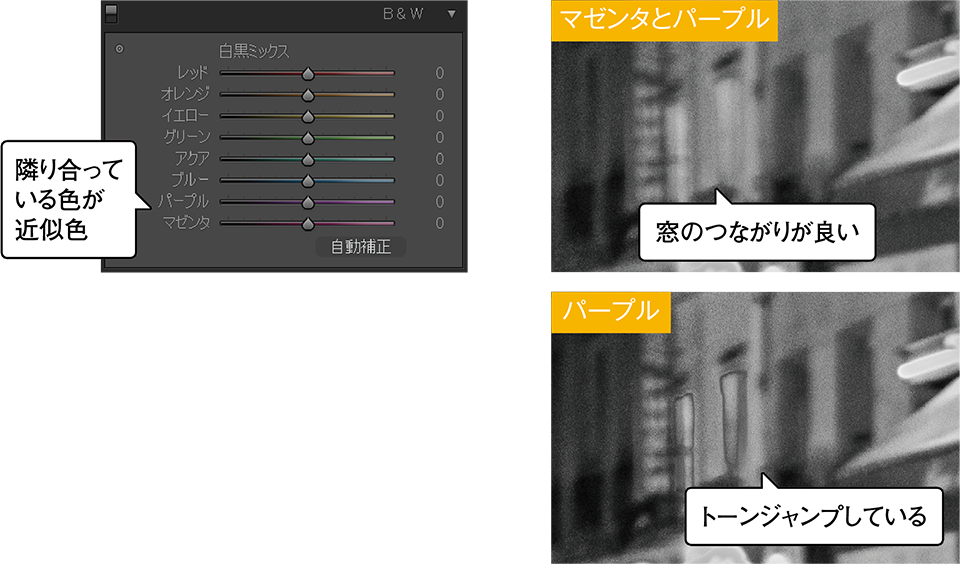 白黒ミックスは色相環に沿っているので近似色を調整すると、トーンがなだらかになる。例えば、パープルを調整するときは、マゼンタやブルーも調整して、トーンジャンプを抑える。