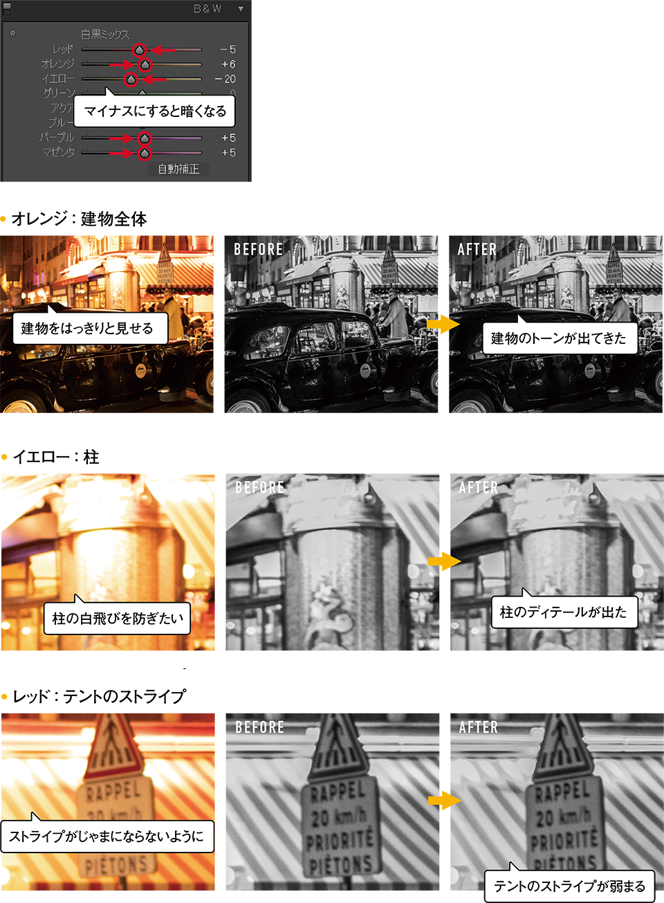 白黒ミックスは色ごとの明るさを自由にコントロールできる機能。オレンジのスライダーを動かすと画像内のオレンジ色の部分だけの明るさをコントロールできる。各色を別々にコントロールできるメリットはあるが、1色だけを大きく動かすと階調が不自然になるので注意したい。今回はパリの街並みがレッド、オレンジ、イエローで構成されていたため、この3色を調整した。加えて、中央付近にマゼンタとパープルのネオンが光っていたため、明るさのバランスを整えた。