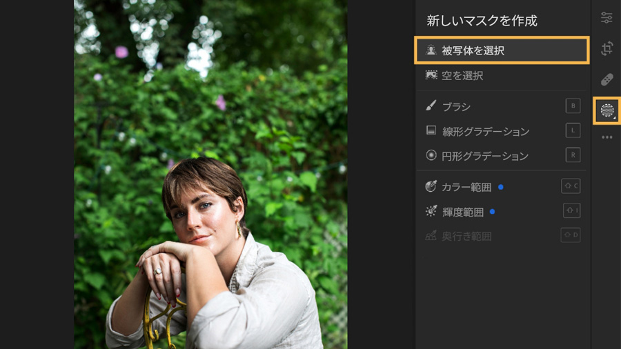 マスクボタンをクリックし、「被写体を選択」を選択します。新しいマスクがモデルの上に自動的に作成されます。