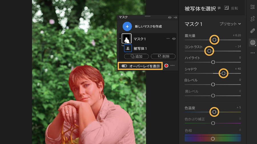 マスクが赤のオーバーレイで表示され、ここでおこなう編集はこの範囲に適用されます。これによって、画像に調整を加えても、マスク外の部分はそのままの状態に維持されます。